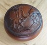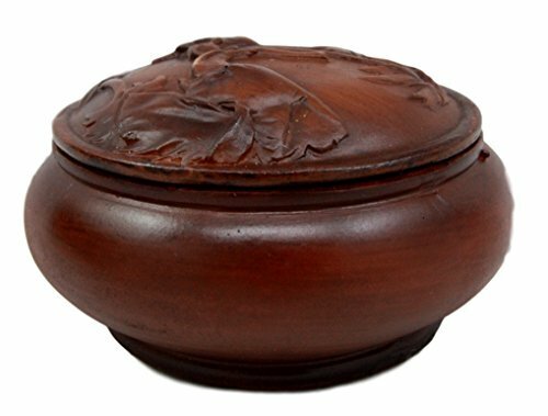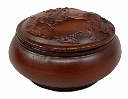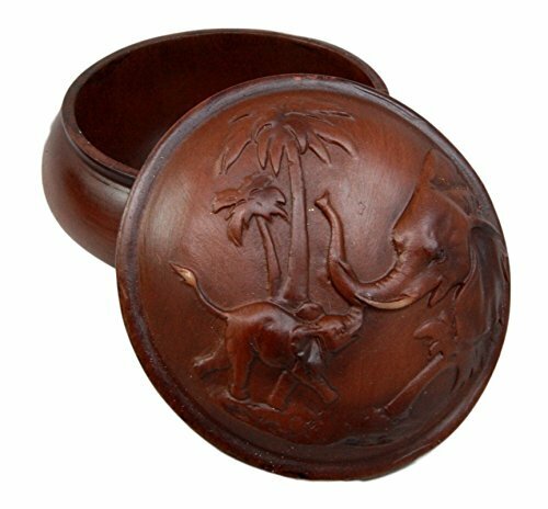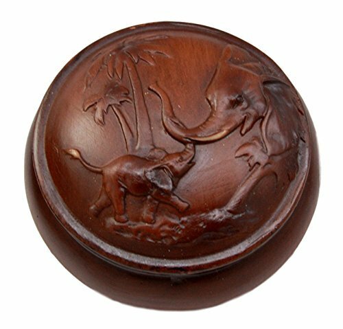 ? Look for a rustic and exotic jewelry holder or other knick knack holder? This rounded faux wood resin box will do the job perfectly!!! On its surface is a carving of a Safari Elephant with its calf.