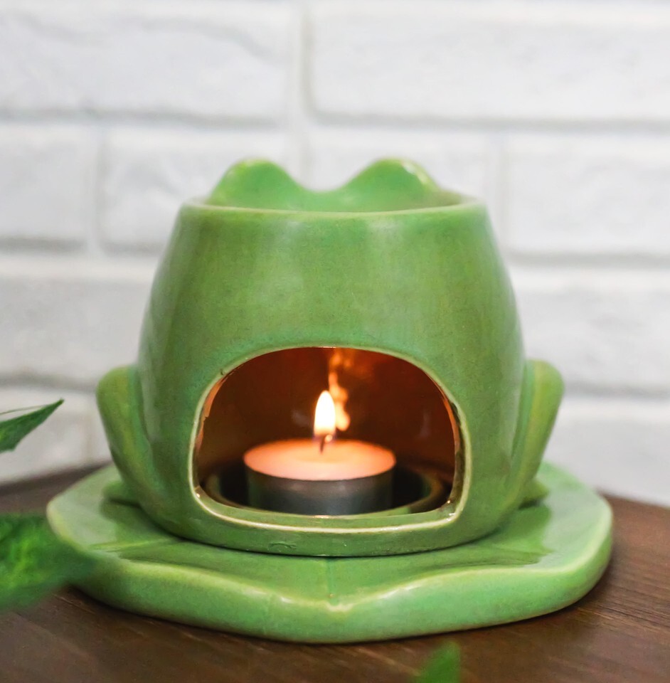 ? Guaranteed to bring joy and smiles, this whimsical frog-shaped oil burner looks as though it's leapt straight out of a fairytale and landed on its matching lily pad plate. A conversation starter, this unique piece is perfect for anyone looking to add extraordinary charm to their home. It also makes a fantastic gift for frog and wildlife lovers alike!