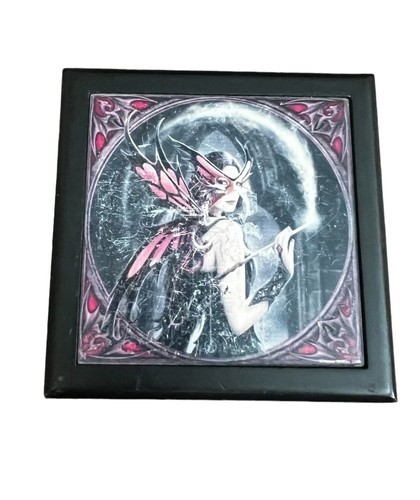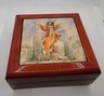 ? This trinket box features a heart shape and a lovely fairy upon the lid! The pixie crouches near some pink flowers, showing off her butterfly wings. Around the edge of the box is a vine design resembling Celtic knotwork.