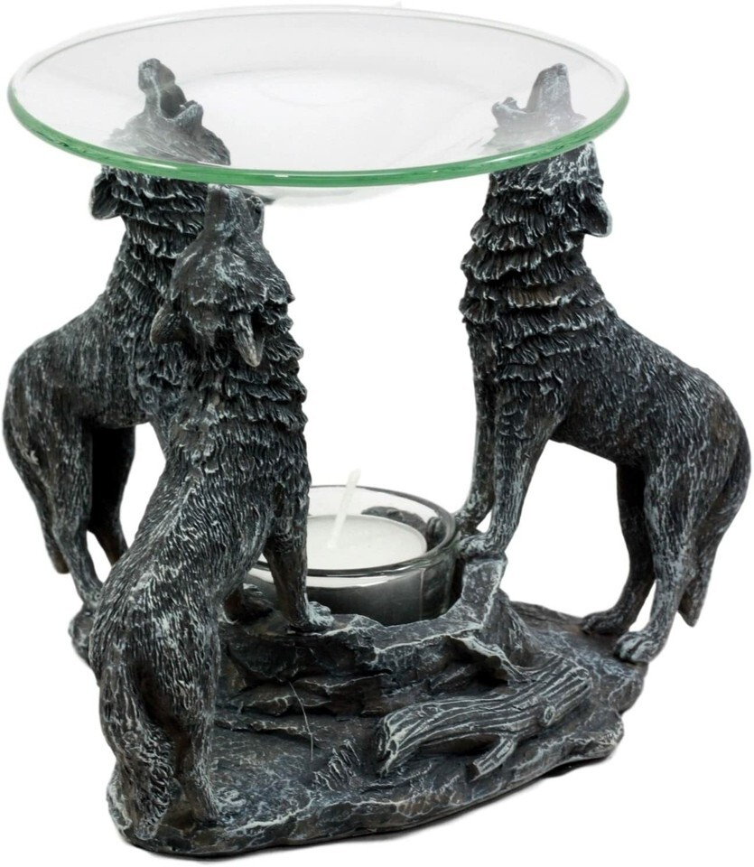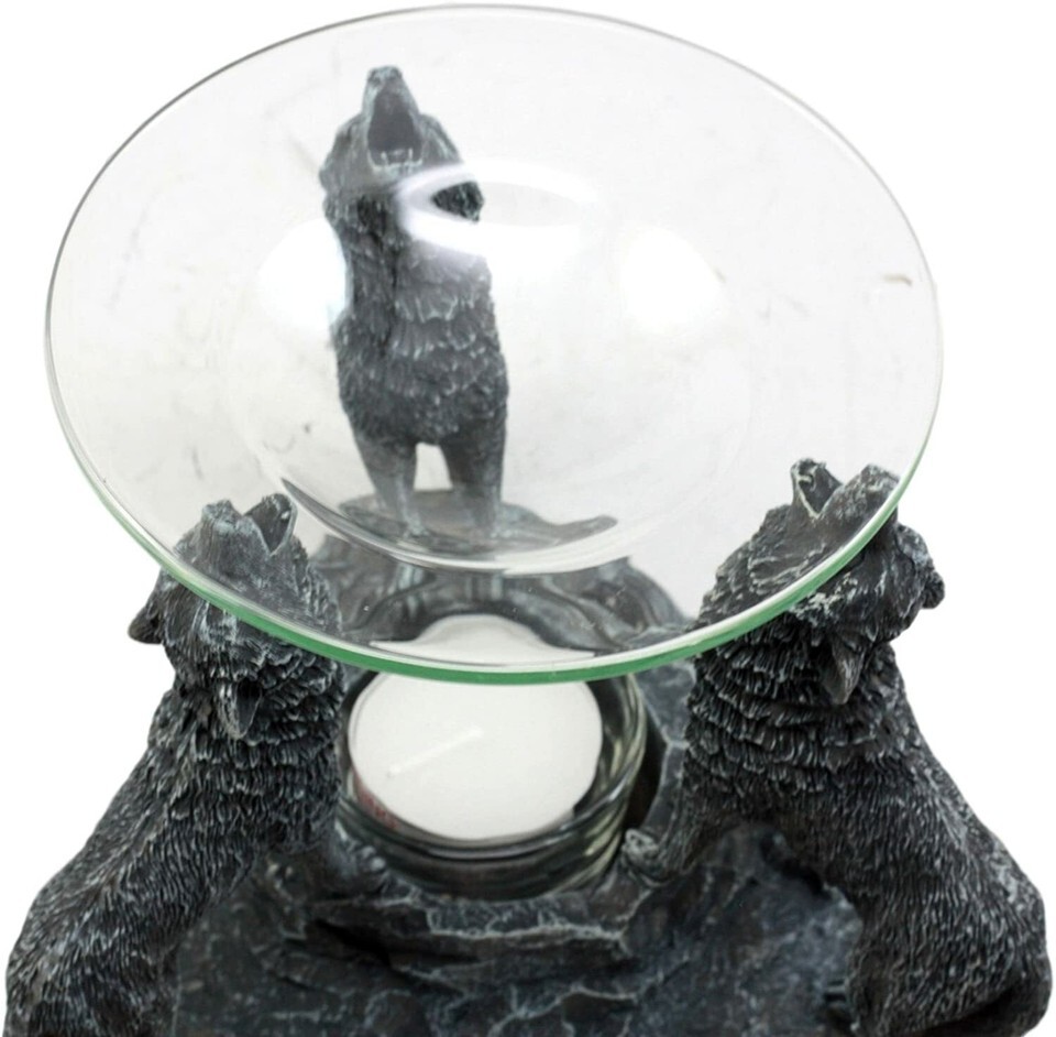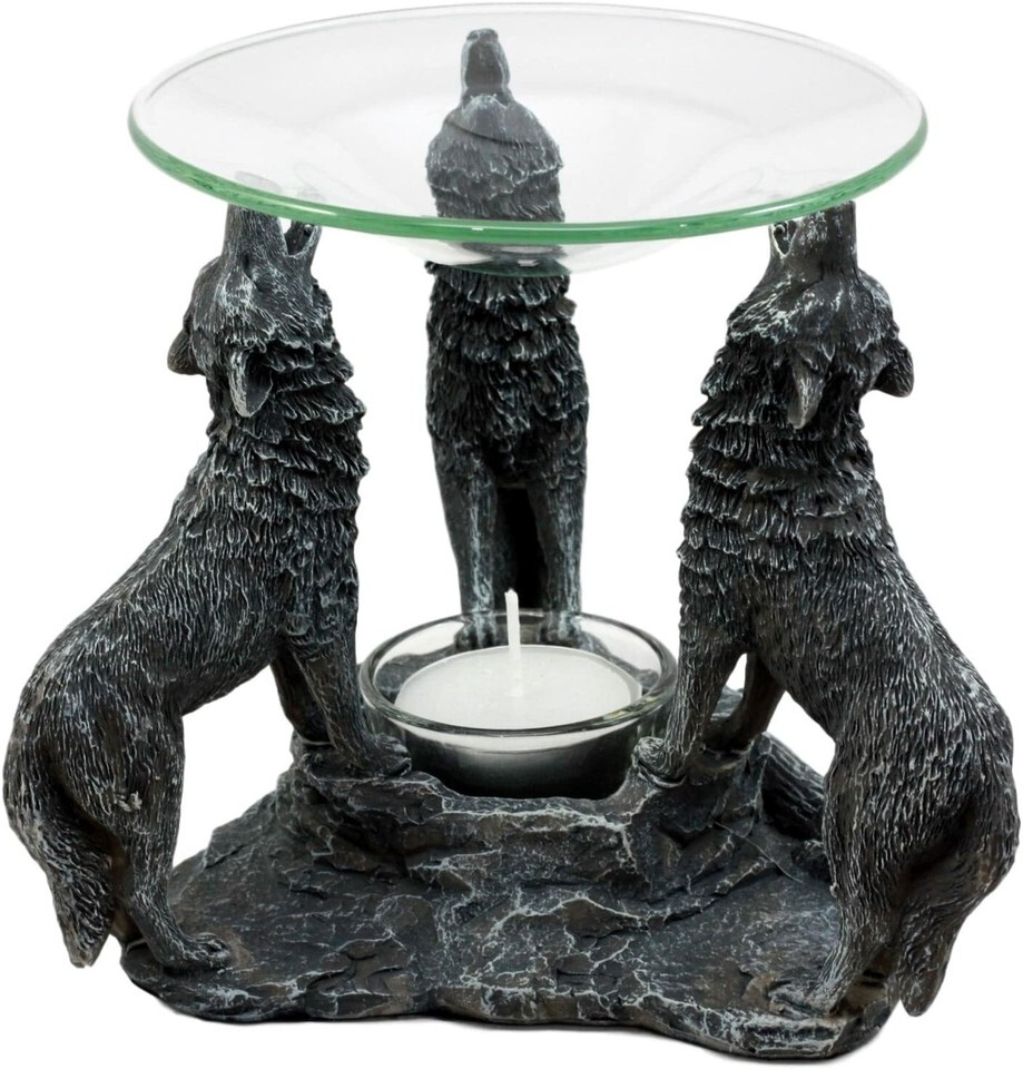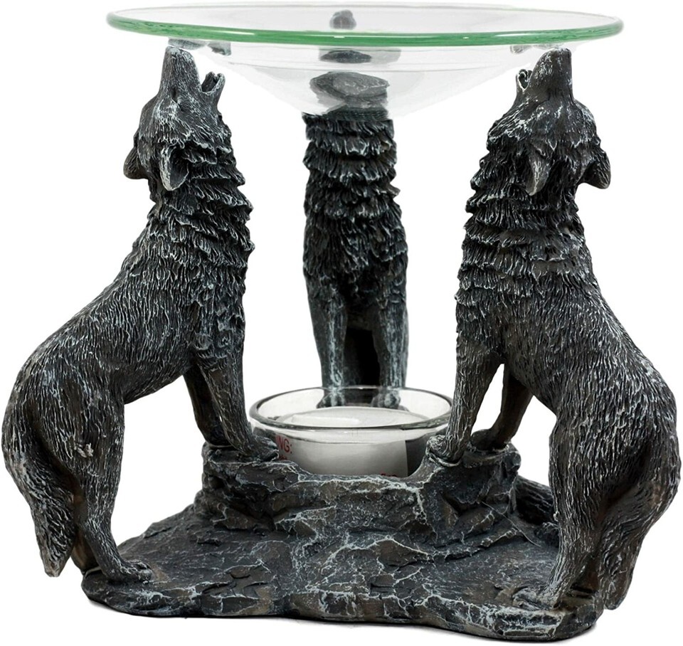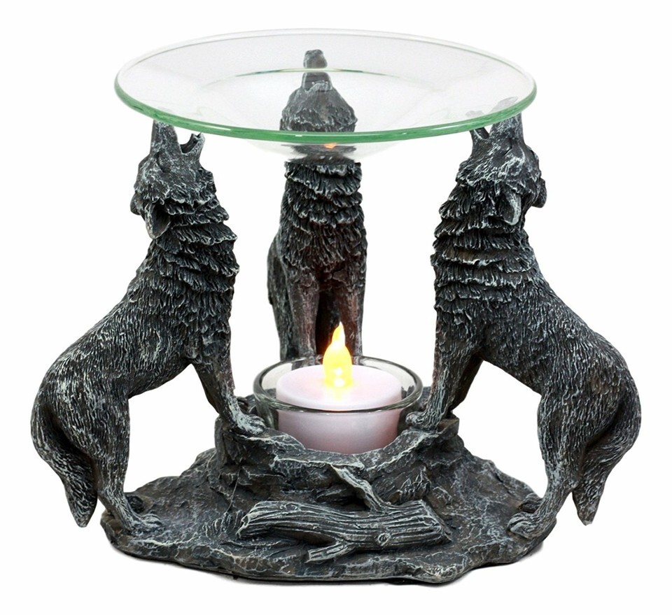 ? Hold your breath and just observe how cool this trio spirit wolf oil warmer figurine is! The three alpha wolves come together in unity as they howl through the night at the moonlit night sky. Use the glass dish to warm your fragrance oils or wax to fill your whole room with a great aroma! This oil warmer is perfect for Halloween, Fantasy themed parties, and other occasions!