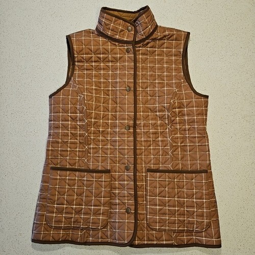 Lands End Reversible Vest Womens M Brown Plaid Diamond Primaloft Quilted Snap
