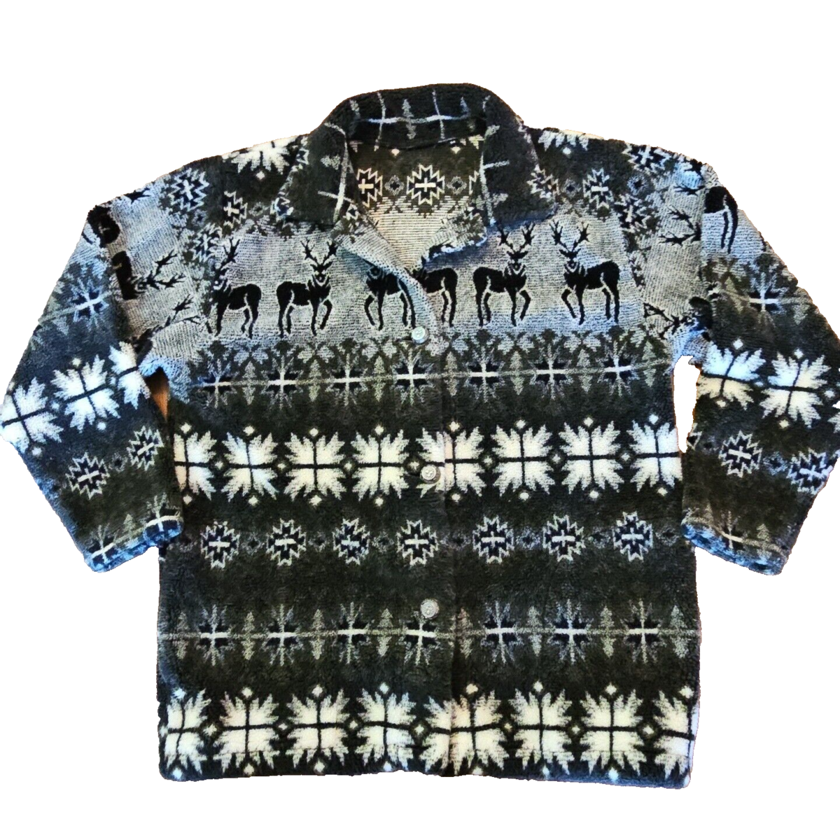 Fleece Sweater Jacket Womens M Deer Snowflake Button Up Sherpa Country Clothing