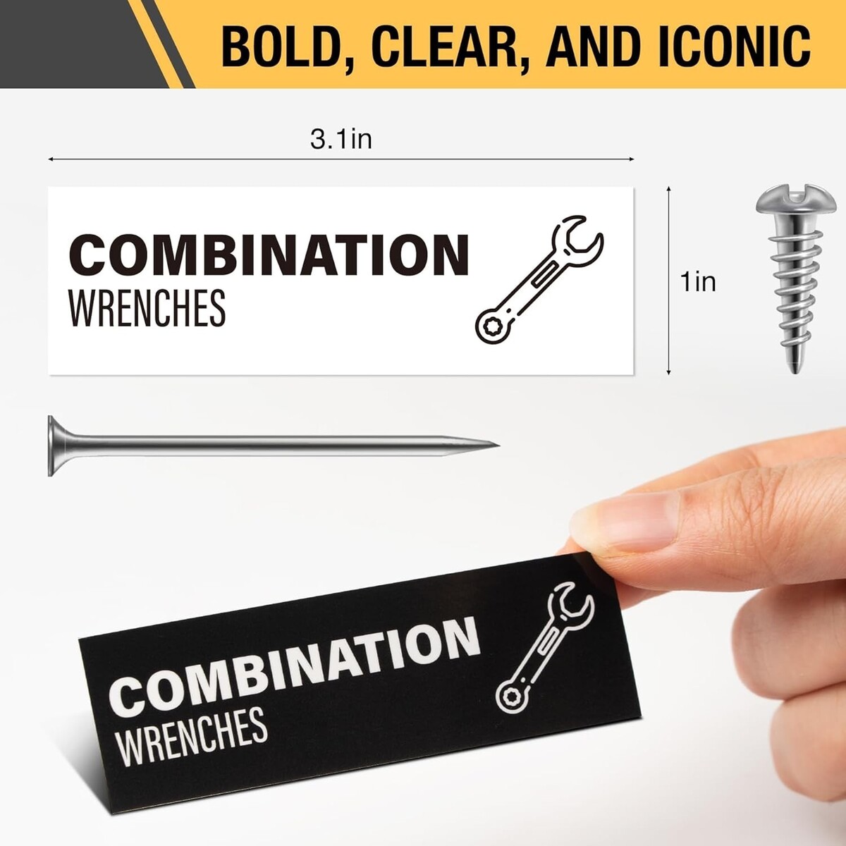 Each label measures 3.1 x 1 inches and features bold black text paired with clear tool icons. The high-contrast design lets you locate the right tool at a glance, even in low-light garages or workshops?ideal for professional mechanics and hobby DIYers alike.