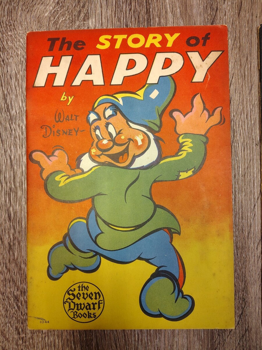 Covers: Vibrant colors. Mild edge wear and some light creasing consistent with age. "The Story of Happy" has a small "1044" number in the bottom corner.