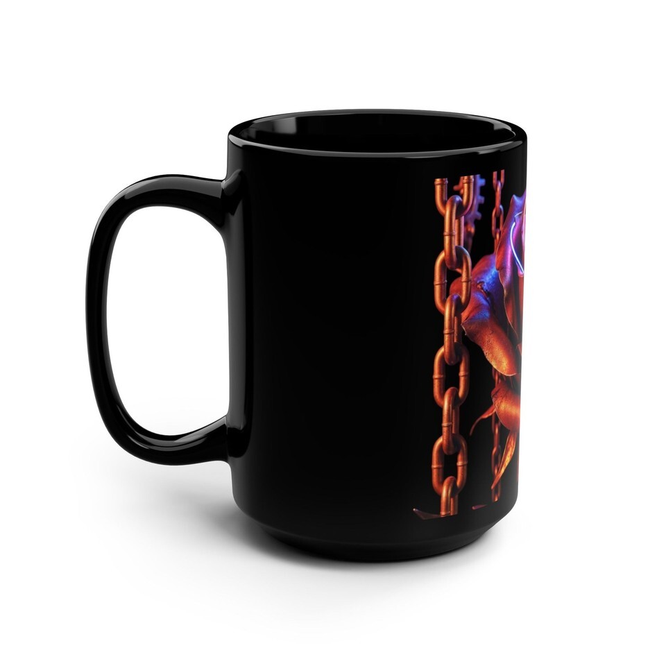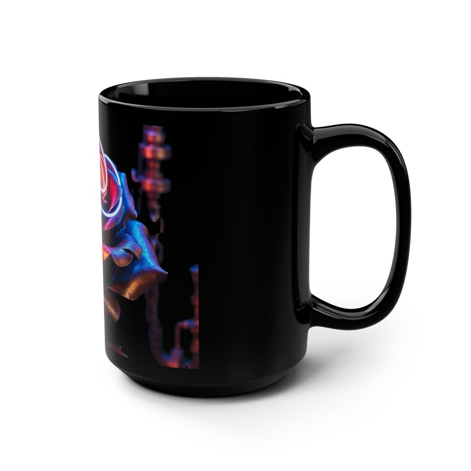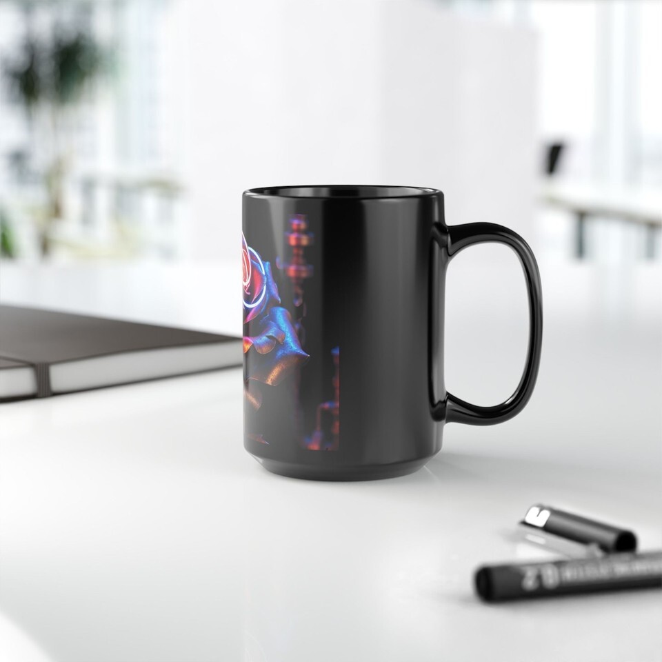 Sip slowly and let color and contrast change the morning. This 15oz black ceramic mug wraps a luminous, neon-tinged rose in deep shadow ? vivid magenta, electric blue and warm gold against a glossy black canvas. It feels like a small, private ceremony: a moment of calm and wonder before the day begins. The C-shaped handle sits comfortably in the hand, the weight steady and familiar. Durable and easy to live with, it goes from microwave to dishwasher without fuss, keeping the art bright through daily use. For those who collect striking, slightly surreal objects or who want a dramatic accent on a crowded desk, this mug brings beauty into routine rituals.