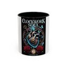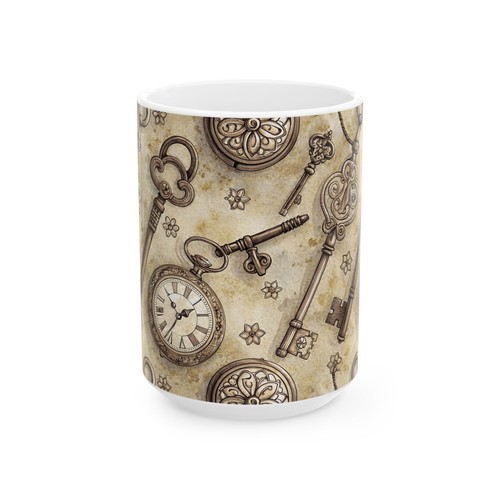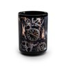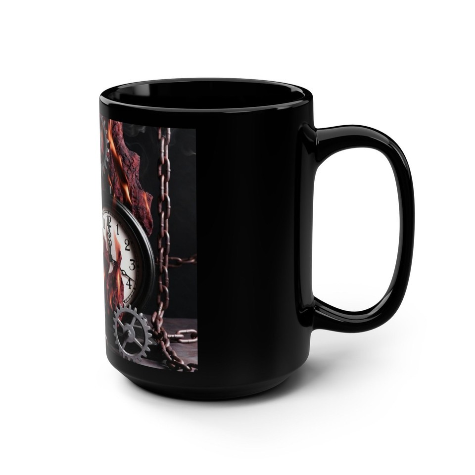 This black 15oz ceramic mug carries a dark, atmospheric design that feels like a page from a clockmaker?s fever dream. Charred gears, a chain, and an antique clock face emerge from licking flames across the glossy surface. It?s the kind of mug that anchors a slow morning or late-night work session ? heavy with mood, quiet intensity, and a hint of rebellion. Warm coffee deepens the contrast of the black glaze and fiery artwork, turning a simple ritual into a moment that suits anyone who loves steampunk, gothic details, or story-driven objects that spark imagination.