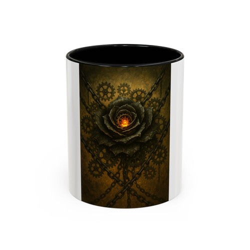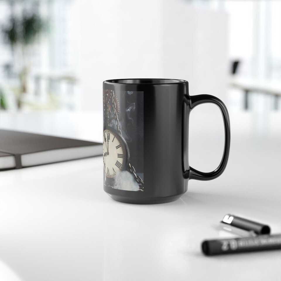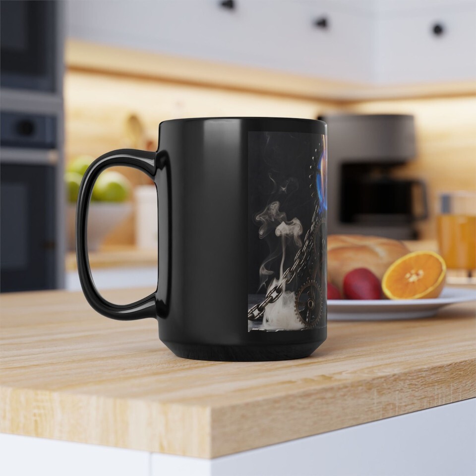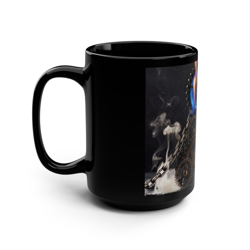 A deep-black ceramic mug wrapped in a moody steampunk scene ? tarnished gears, an antique clock face, and a little blue flame dancing above the cogs. Hold it and you feel like you?ve paused time for a quiet, curious moment. The glossy finish catches light and highlights the intricate metalwork, while the 15 oz size gives extra room for a slow morning coffee or long evening tea. This mug sits naturally on a cluttered desk between notebooks and sketches, or beside a well-loved paperback as hours slip by. Built for thoughtful drinkers who like objects with a story, it blends practical everyday use with a touch of vintage mystery.