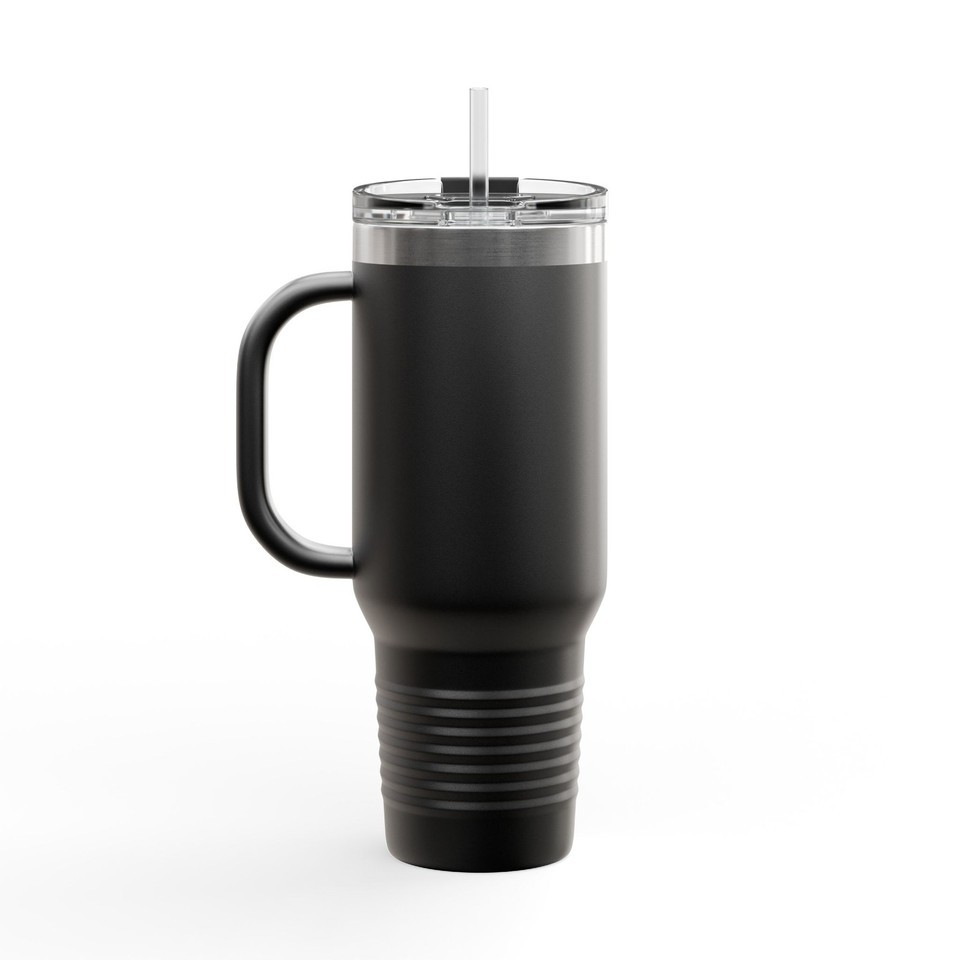 This 40oz insulated travel mug keeps your drink at the temperature you want, long after you leave the house. The tall stainless steel body and double-wall construction trap heat or cold while resisting rust and wear. A comfortable ergonomic handle and secure, leak-resistant lid with a reusable straw make it easy to sip on the move ? from early morning commutes to long workdays and weekend road trips. The powder-coated finish accepts vivid UV-DTF artwork for a bold, lasting look, and eight color options let you match personal style. BPA-free and built for repeated use; hand washing preserves the printed design.