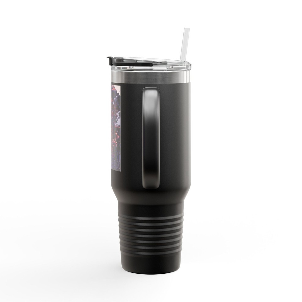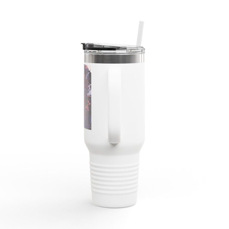 This 40oz insulated travel mug blends rugged functionality with artful detail. Built from sturdy stainless steel with a powder-coated finish, it holds a full day?s worth of coffee or cold brew and keeps temperatures steady thanks to double-wall insulation. The ergonomic handle and included straw make long drives, work shifts, and outdoor outings easier. A leak-resistant push-on lid locks in spills, while UV-DTF printed artwork adds a textured, gallery-style accent that stands out against the clean white shell. Lightweight enough to carry, durable enough for daily use, and available in multiple colorways to match your kit.