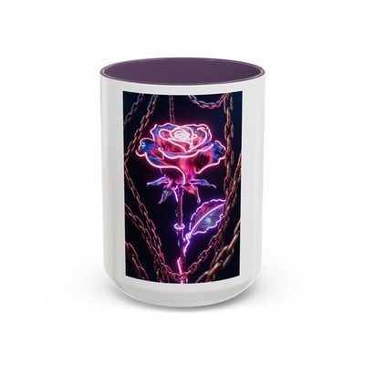 This ceramic mug brings a splash of electric romance to your everyday ritual. A neon-style rose blooms against a dark backdrop, its glowing petals threaded through weathered chains ? a contrast of softness and edge. The colored interior and handle frame the artwork, making morning coffee feel like a late-night diner scene or a quiet moment in a city that never sleeps. The glossy finish intensifies the vibrant hues, so each sip carries a little pulse of color and attitude.