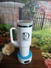 This 40oz insulated tumbler brings quiet reliability to long days on the move. Double-wall vacuum insulation locks in temperature so coffee stays hot and iced drinks stay cold through errands, hikes, or back-to-back meetings. The glossy finish and engraved design age gracefully ? the etched artwork blends into the steel for a subtle, lived-in look. A large, comfortable handle and tapered base make it simple to carry and fit most cup holders. The press-fit slider lid with matching straw minimizes spills while still letting you sip without pausing the day. Thoughtfully made from recycled stainless steel and recycled plastic, it?s built to last and to be used again and again. Hand wash only to preserve the engraving and finish.