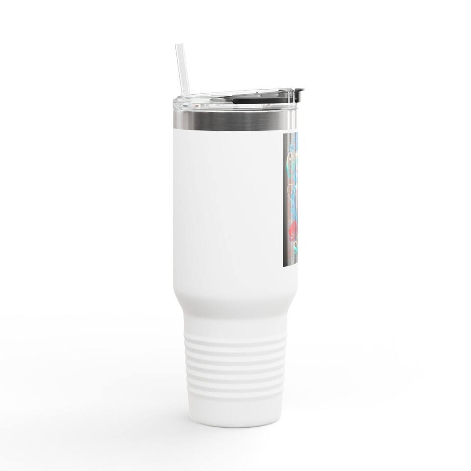 This 40oz insulated travel mug holds a full day?s worth of coffee or iced drinks and carries a bold, art-forward design that reads like a mini poster. It feels sturdy in the hand and sits comfortably in most cup holders, while the ergonomic handle and included straw make long drives and outdoor shifts easy to manage. Double-wall stainless steel locks in temperature so morning brews stay hot and afternoon refreshments stay cold. The powder-coated finish gives the surface a tactile, matte look that lets the printed artwork stand out without feeling slick. Use it on work commutes, road trips, or studio sessions when you want a practical companion that also shows off personality.