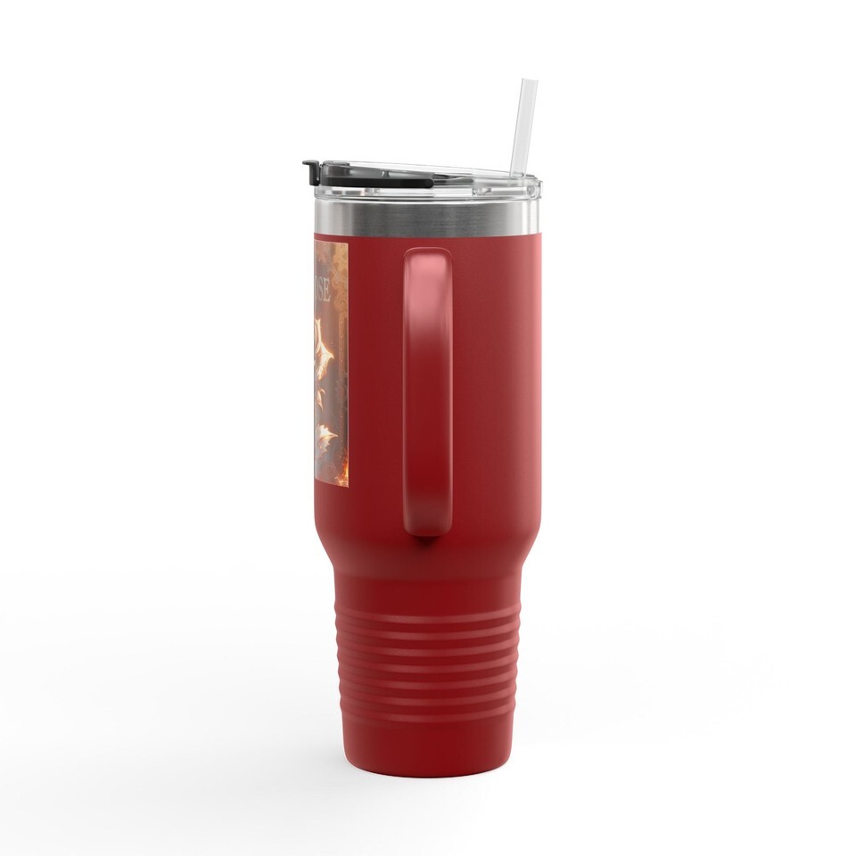 A rugged, 40oz insulated travel mug that holds a full day?s worth of coffee or iced tea without losing temperature. Built from rust-resistant stainless steel with double-wall insulation, this tumbler keeps hot drinks steaming and cold drinks chilled for hours. The ergonomic handle and included straw make it easy to sip on the move ? whether you?re heading out for a long drive, working a full shift, or settling in at a campsite. The secure leak-proof lid uses a tight push-on seal and latch to prevent spills, and the powder-coated finish gives the mug a tactile, durable surface that stands up to daily use. Printed artwork adds a personal, bold touch that makes this more than just a drink container; it?s a dependable companion for long days and long routes.