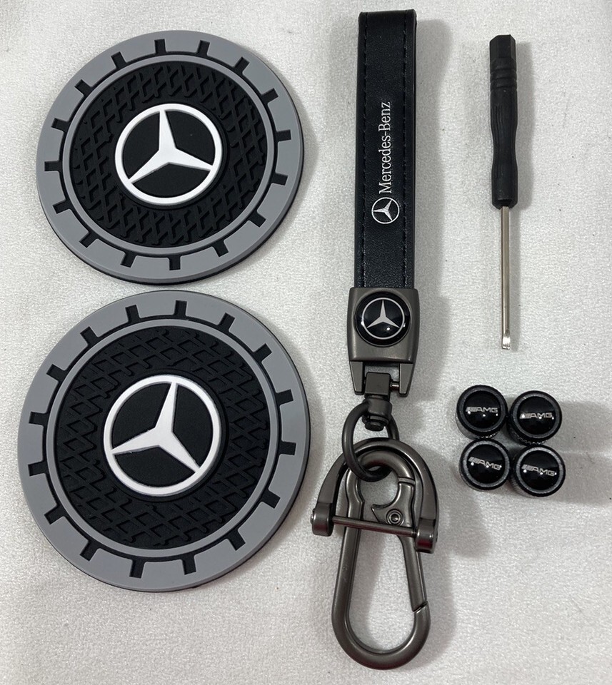 What a nice set. This brand new set includes Genuine Leather Lanyard for your keys, a set of 2 cupholders and a 4 set of tire stem air valve covers. This set is a must-have accessory for any car enthusiast. The lanyard for your keys is made with premium black leather and featuring a clip-on design, is both stylish and practical. The Black with silver stripes Metal Tire Air Stem Valve Covers, add a touch of luxury to your automotive accessories collection. Crafted in China, this high-quality lanyard, metal caps with Mercedes racing AMG insignia and cupholders is the perfect addition to any Mercedes owner's gear.