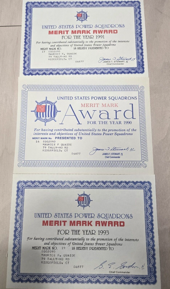 Lot Of 3 Vintage US Power Squadron Merit Mark Award Certificates