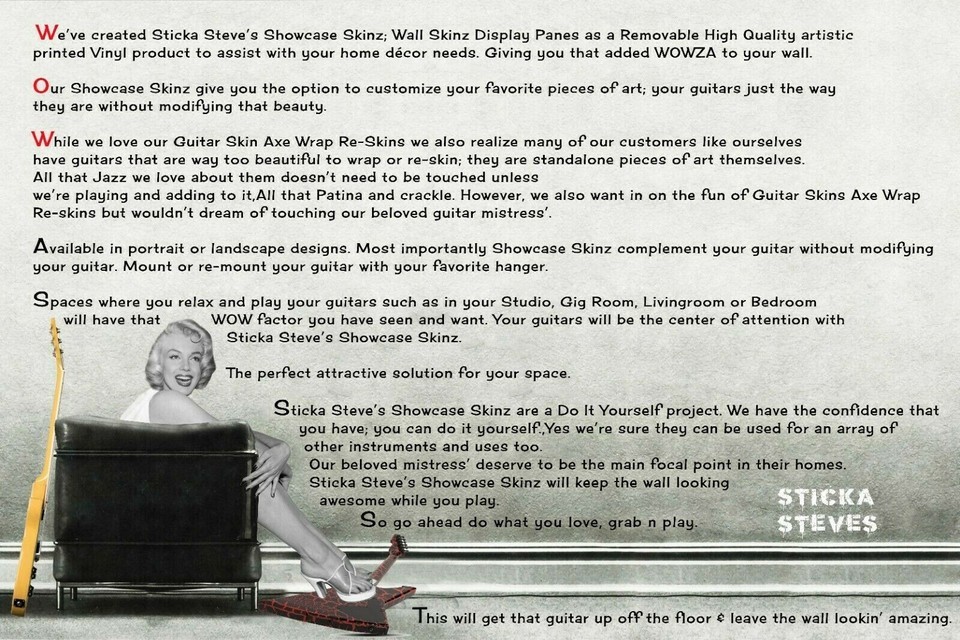 We?re confident that you can Do It Yourself; therefore, we offer you Showcase Skinz to help you achieve your goal of displaying your beautiful guitars as a main focal point.