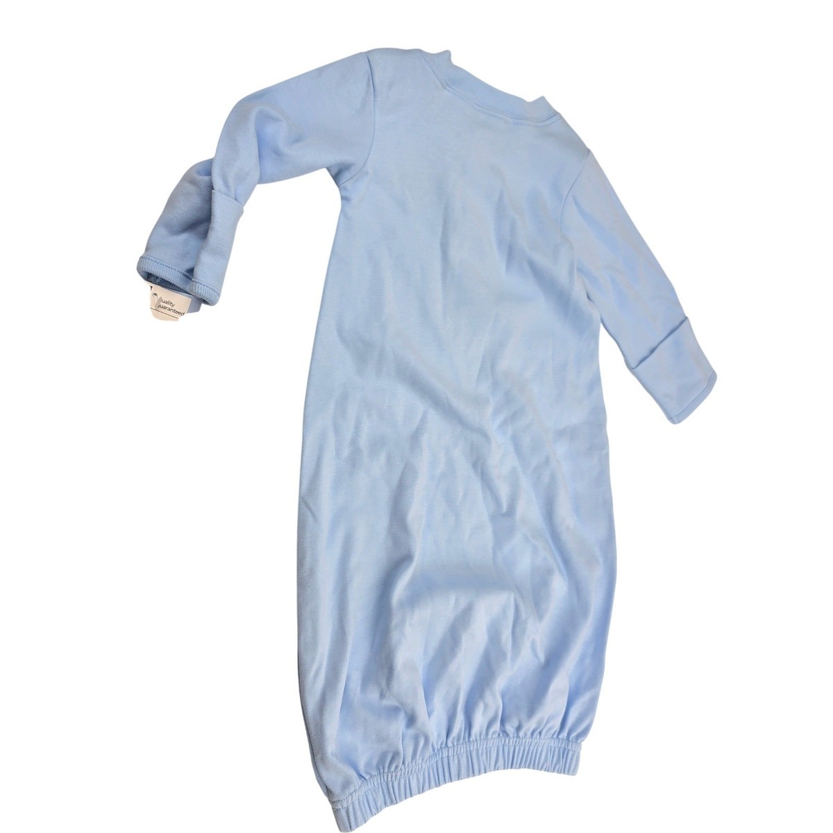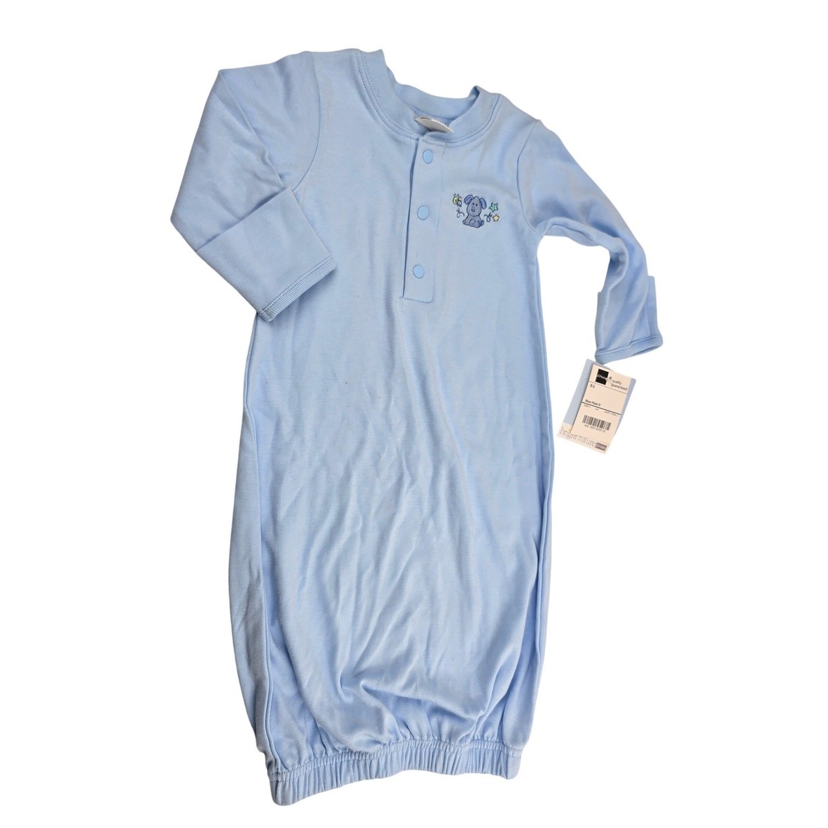 Keywords: baby gown, sleep sack, newborn, infant, baby shower gift, cotton, embroidered, blue, long sleeve, snap closure, gown, convertible, vintage retro nostalgic 00s 2000s