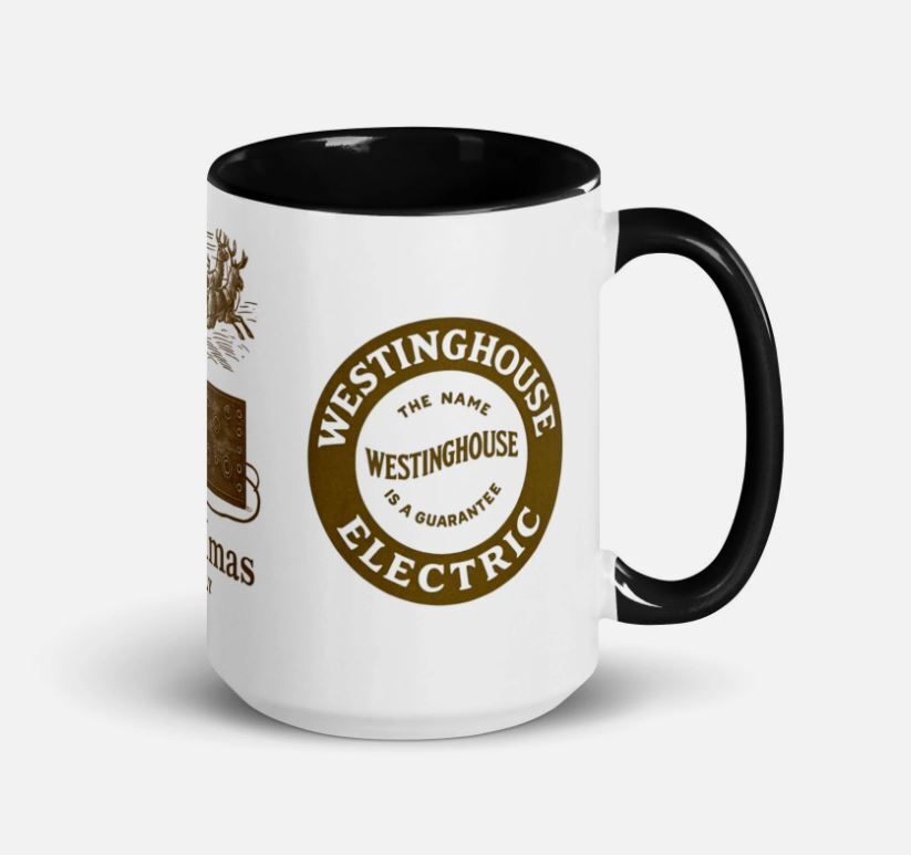 This mug features a faithful reproduction of a 1920s Westinghouse holiday advertisement — the one that cheerfully urged: