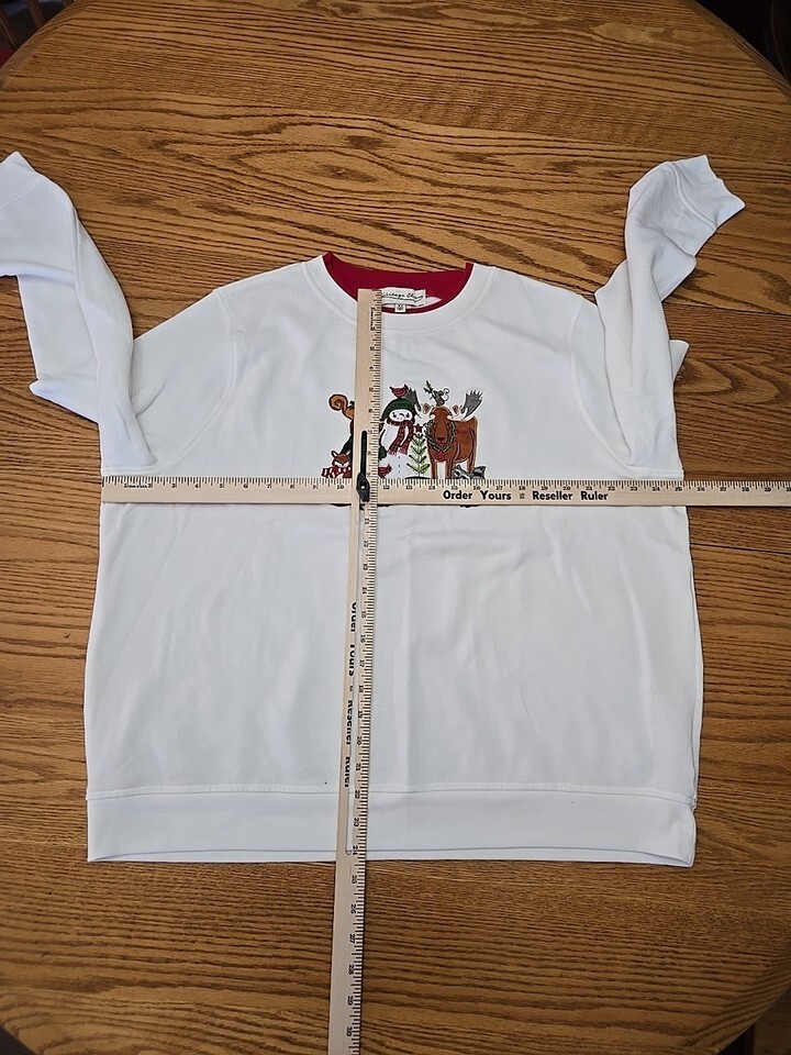 The Heritage Charm Christmas Crewneck Sweatshirt in Women's Size XL is a cozy and festive addition to your holiday wardrobe. Made from a blend of polyester and cotton, this white sweatshirt features an animal print pattern with embroidered accents, giving it a charming and unique look. The pullover style with a mock neck neckline and long sleeves makes it perfect for staying warm during the winter season. Whether you're wearing it for travel, activewear, casual outings, or workwear, this sweatshirt adds a touch of classic 90s style to your ensemble.