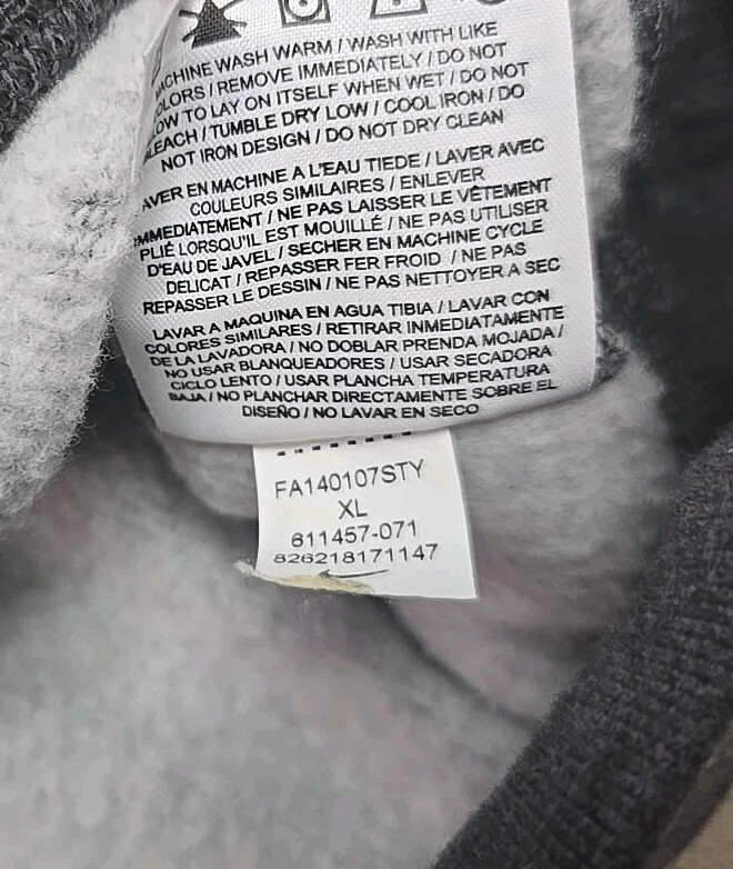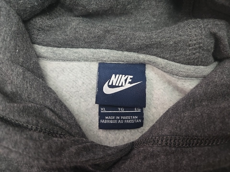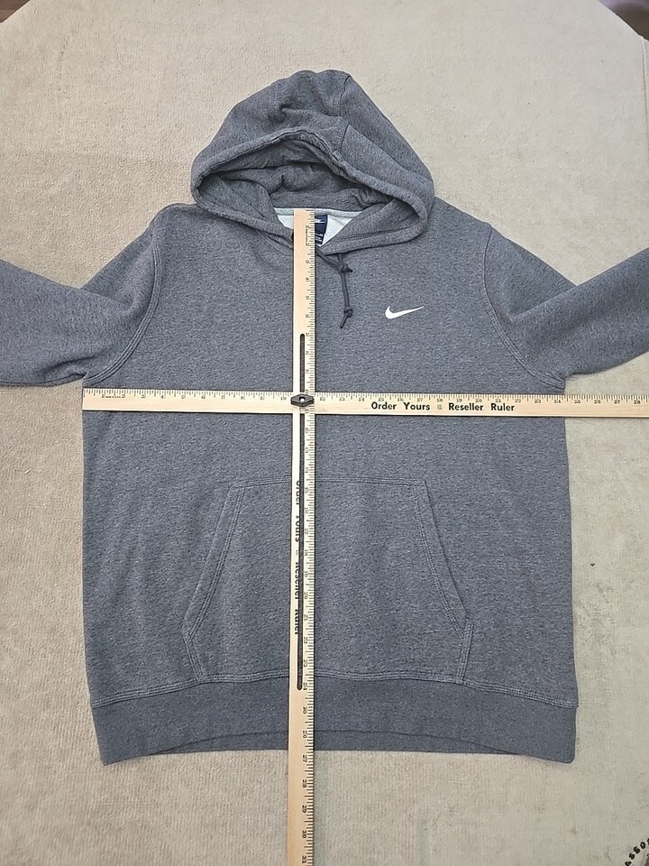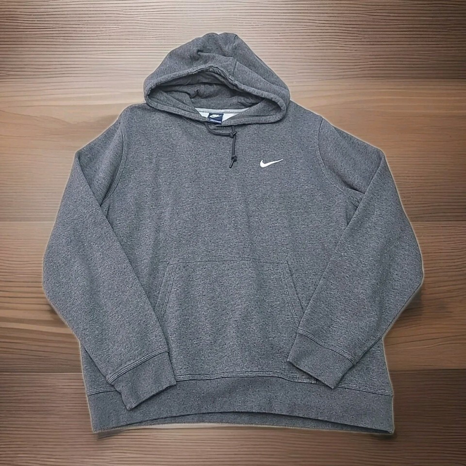 Stay cozy and stylish with this pre-owned Nike Hoodie from Fall 2014. The gray pullover features a solid pattern and long sleeves with a drawstring closure. It's made of a soft polyester and cotton blend with a fleece fabric type and lined with cotton. The hoodie has pockets and an embroidered logo with Nike's iconic Swoosh design.