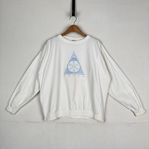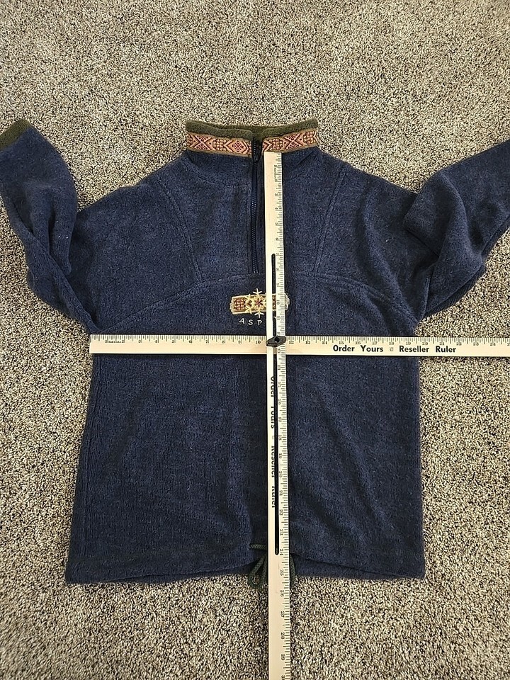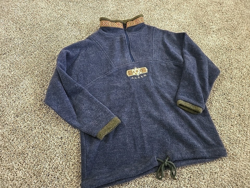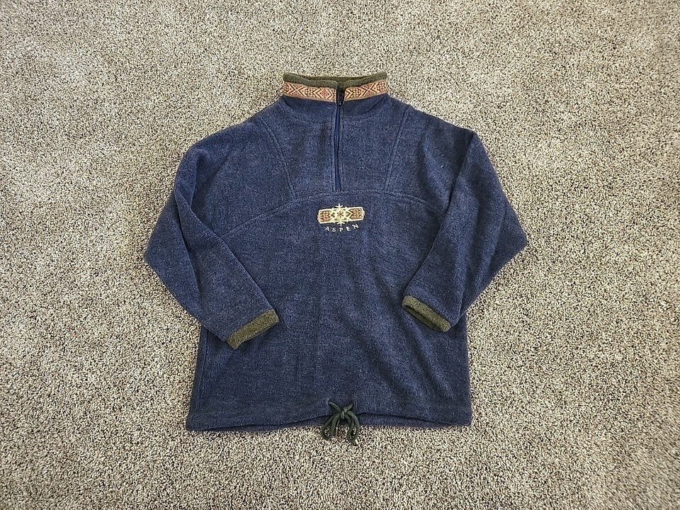 This vintage 90s Aspen Snowflake 1/4 zip fleece sweatshirt by lifestyles is the perfect resort wear for women size small. The blue sweatshirt features a snowflake pattern embroidered on it, making it ideal for holiday or outdoor occasions. Made from a blend of polyester and acrylic, the relaxed fit sweatshirt has long sleeves and a collared neckline for added comfort. With a 1/4 zip closure and machine washable fabric, this pullover sweatshirt is a stylish and cozy addition to your winter or fall wardrobe.