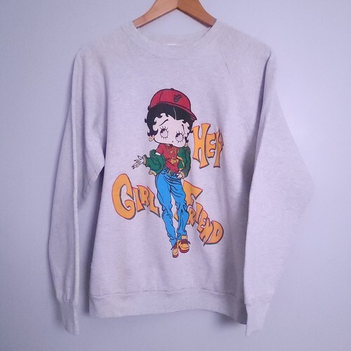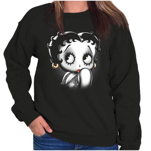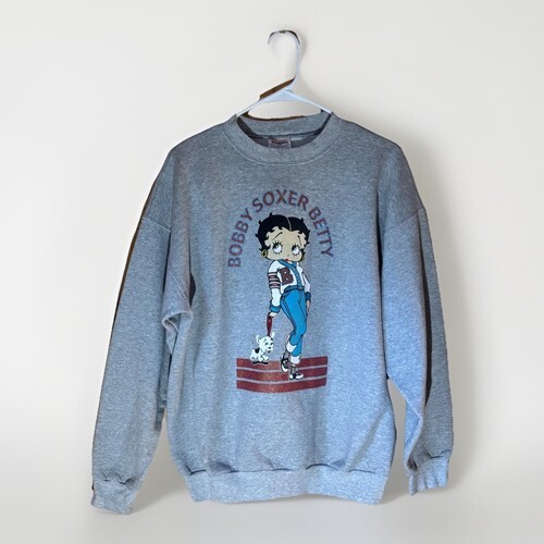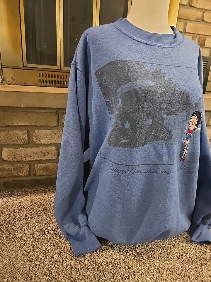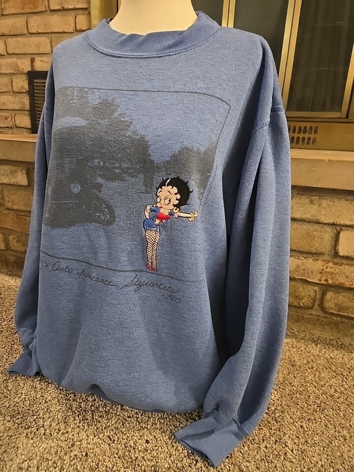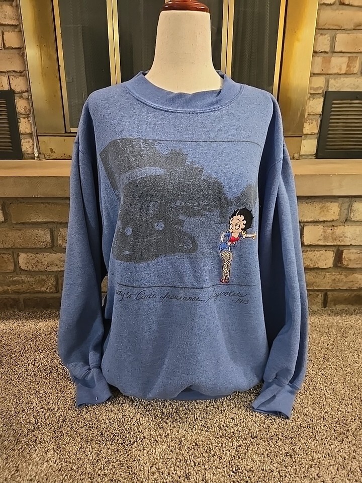 The Blitzz Studios Vtg 90s Betty Boop Pin Up Crewneck Sweatshirt is a vintage women's size large sweatshirt featuring an embroidered Betty Boop graphic print. This pullover sweatshirt is perfect for casual activewear occasions, with a crew neck and long sleeves making it ideal for winter, fall, or spring seasons. The blue cotton blend fabric is machine washable for easy care, and the sweatshirt is designed with a regular fit for a comfortable and classic look. Ideal for fans of cartoon characters and retro style, this Betty Boop sweatshirt is a stylish and nostalgic addition to any wardrobe.