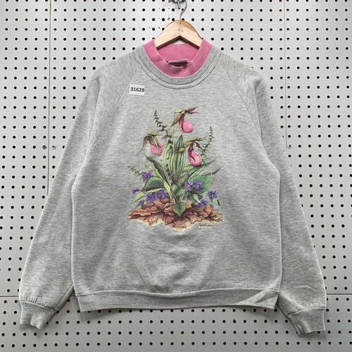 The Jerzees Morning Sun vintage 90's sweatshirt is a women's size large pullover made of a blend of polyester and cotton fleece fabric. It features a floral pattern with a gray color, long sleeves, and a crew neckline with a double collar accent. The sweatshirt is machine washable and has a regular fit, making it perfect for casual occasions in the winter, fall, or spring seasons. Made in the USA, this sweatshirt also has a graphic print with themes of USA, grandma, and 90s, adding to its unique vintage appeal.