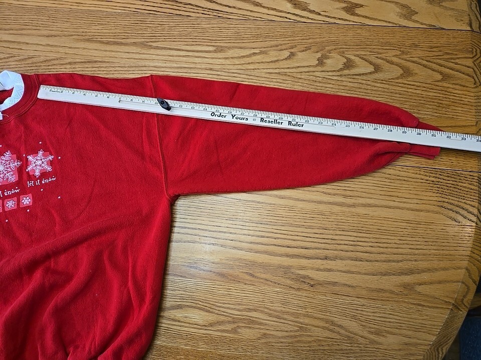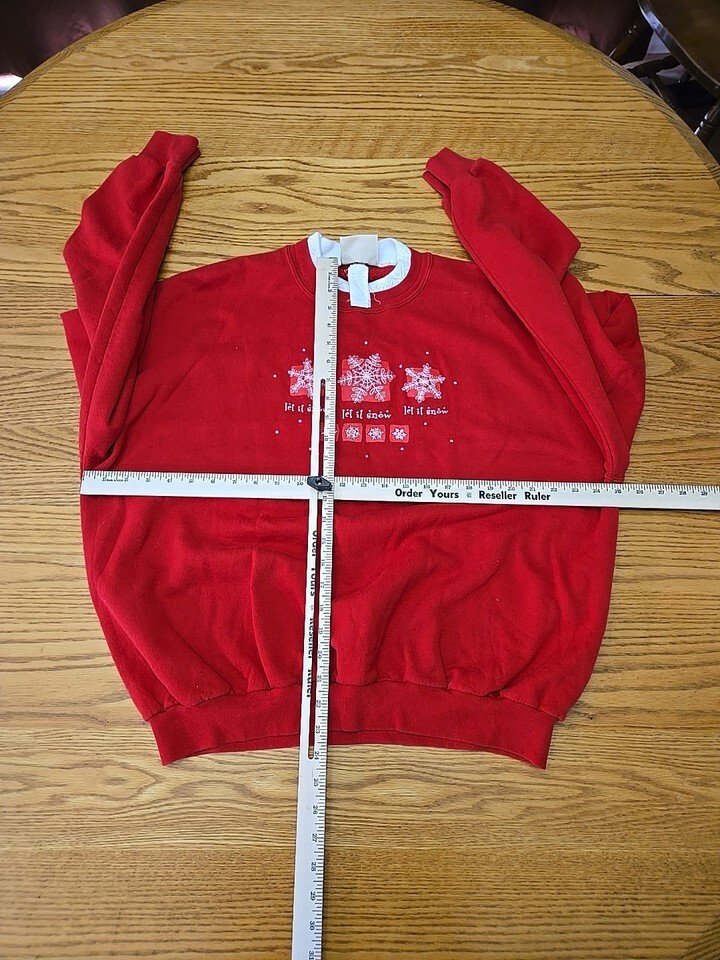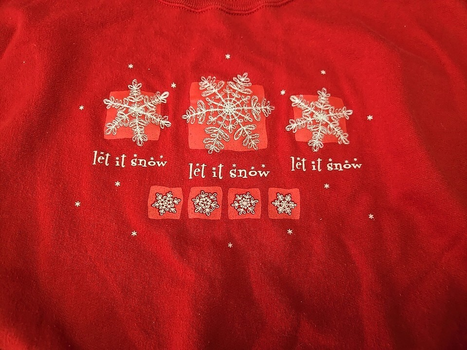 The Top Stitch Morning Sun Vtg 90's Christmas Sweatshirt in Women's size XL is a vintage piece featuring a festive snowflake pattern, Santa Claus character, and a classic red color. Made of a cotton blend fleece material, this pullover sweatshirt with a mock neck and long sleeves is perfect for various occasions including casual, travel, party/cocktail, and business. With a 1/4 zip feature, this sweatshirt is versatile for winter, fall, and spring seasons, embodying the themes of Granny Core, Christmas, 80s, 90s, and Cottage Core styles. Made in Mexico, this vintage sweatshirt from the Top Stitch product line is a cozy and stylish addition to any wardrobe.