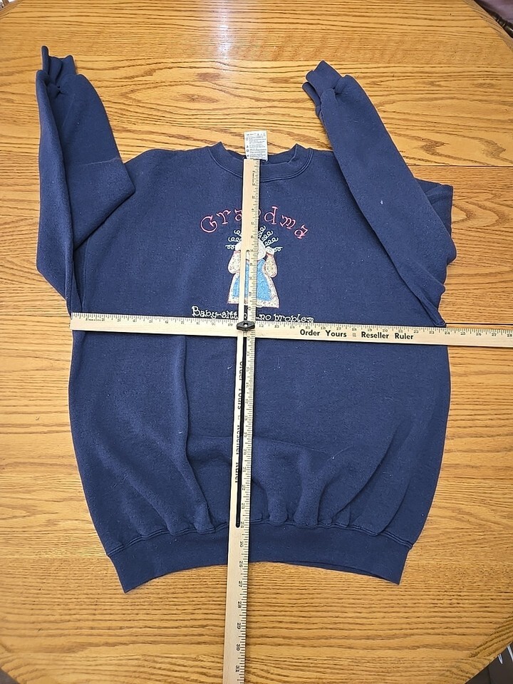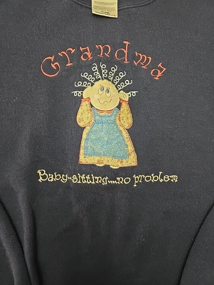The Tultex Vintage Crewneck Sweatshirt in women's size XL is a navy blue pullover with a grandma pattern embroidered on it. Made from a polyester and cotton blend fleece fabric, this sweatshirt is machine washable and has a crew neck and long sleeves. Perfect for winter, fall, or spring, this sweatshirt is adorned with a graphic print featuring hearts, the USA, and a 90s vibe. Ideal for activewear, this sweatshirt is versatile for walking or school activities, adding a touch of vintage style to your wardrobe.