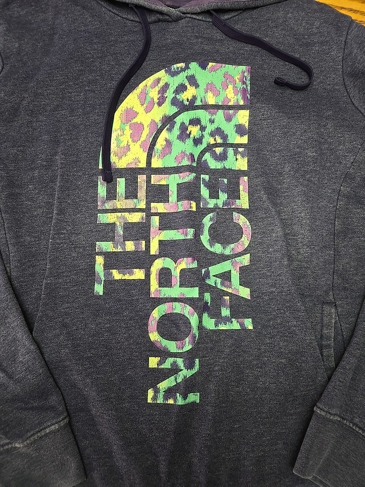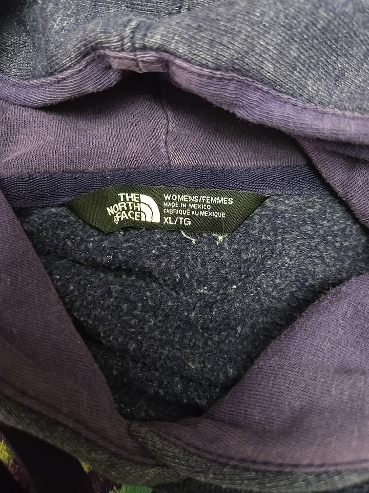 The North Face Hoodie Sweatshirt in Women's size XL features a stylish purple leopard and cheetah logo design, perfect for adding a touch of animal print to your activewear collection. This pullover hoodie is ideal for casual or outdoor activities like walking, hiking, or running, with a hooded neckline and long sleeves for added warmth. Made from knit fabric, this hoodie is machine washable and easy to care for. The North Face brand ensures quality and durability, making this sweatshirt a versatile and fashionable addition to your wardrobe.