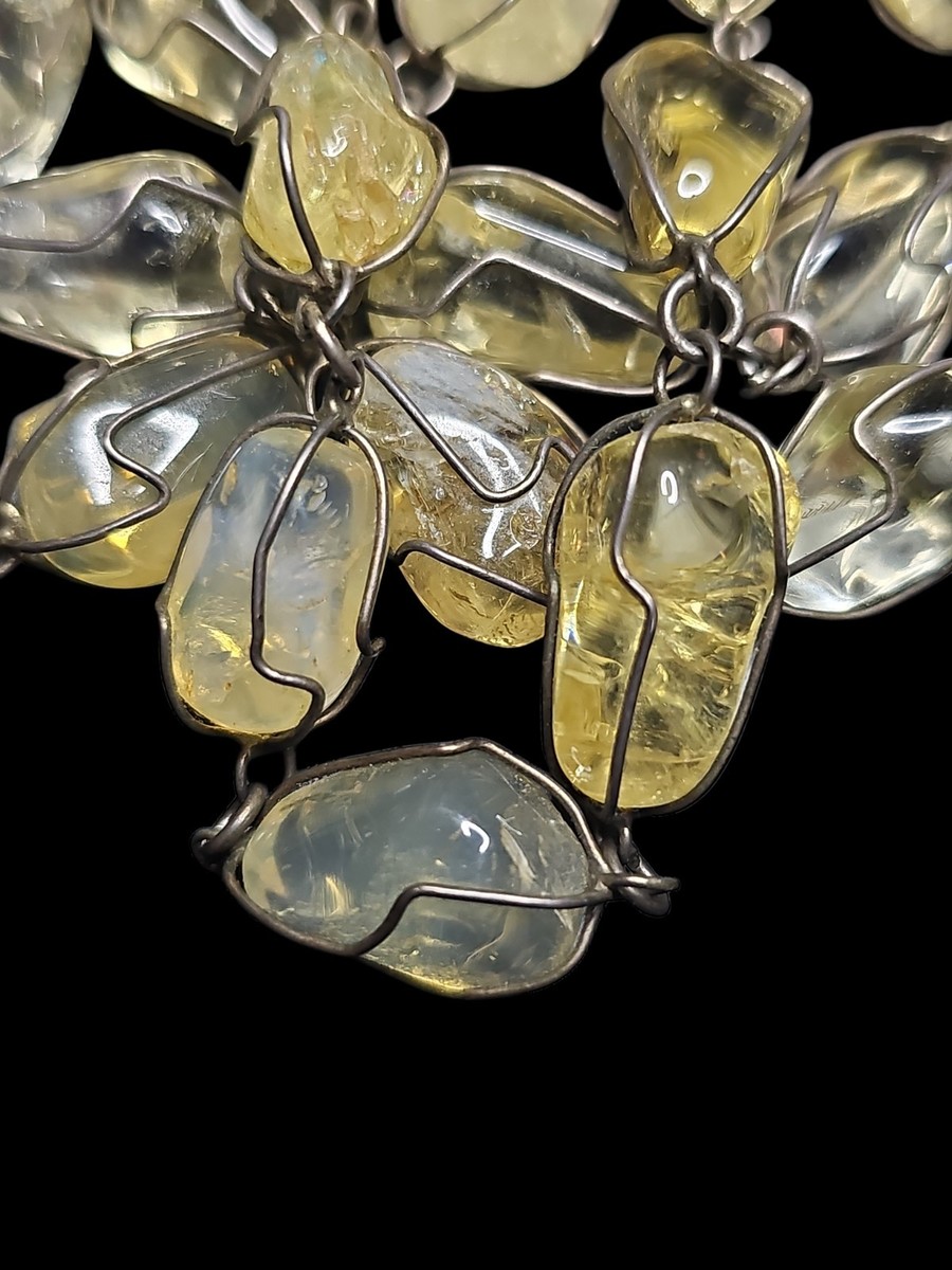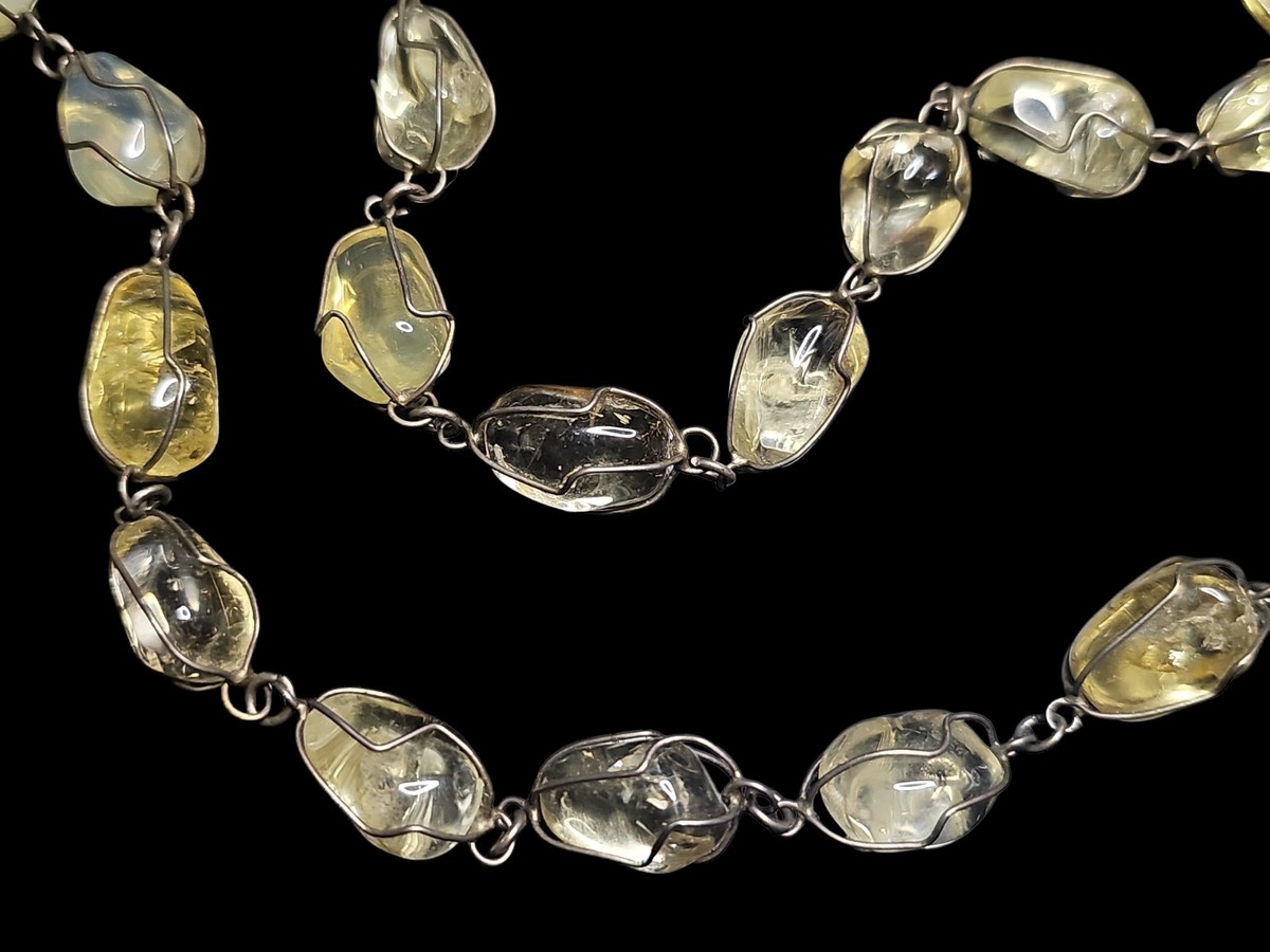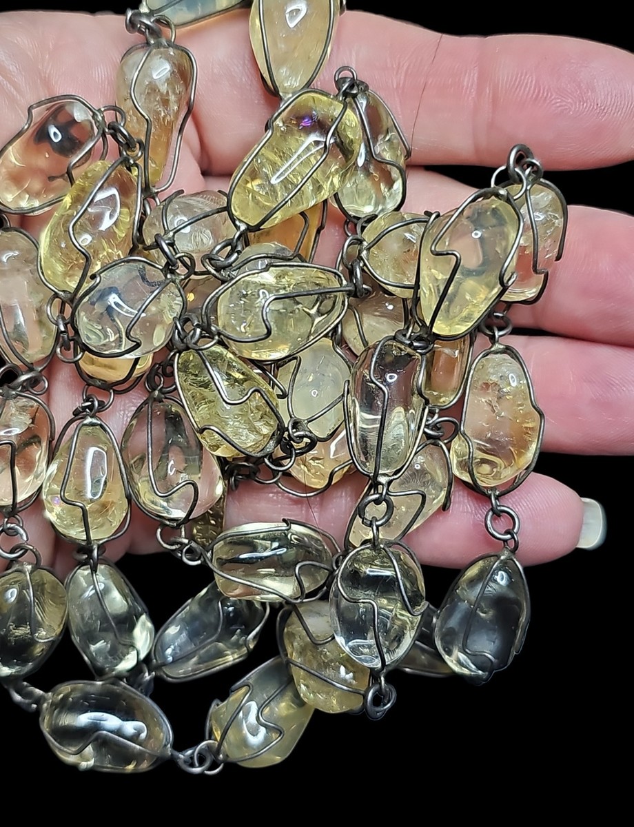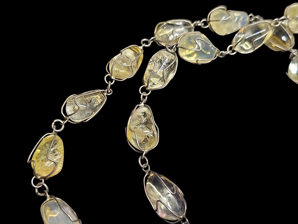 Vintage artisan necklace featuring hand-wrapped translucent yellow nugget stones linked in tested sterling silver. The stones display natural internal character with tones ranging from pale champagne to warm honey yellow, giving the necklace beautiful depth and movement.