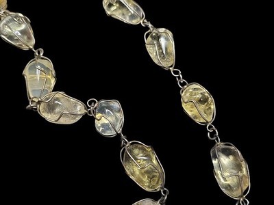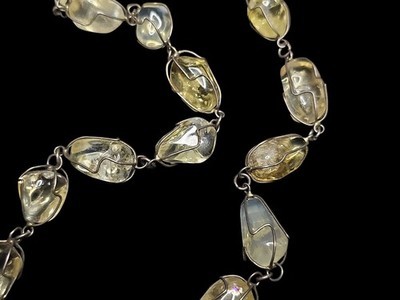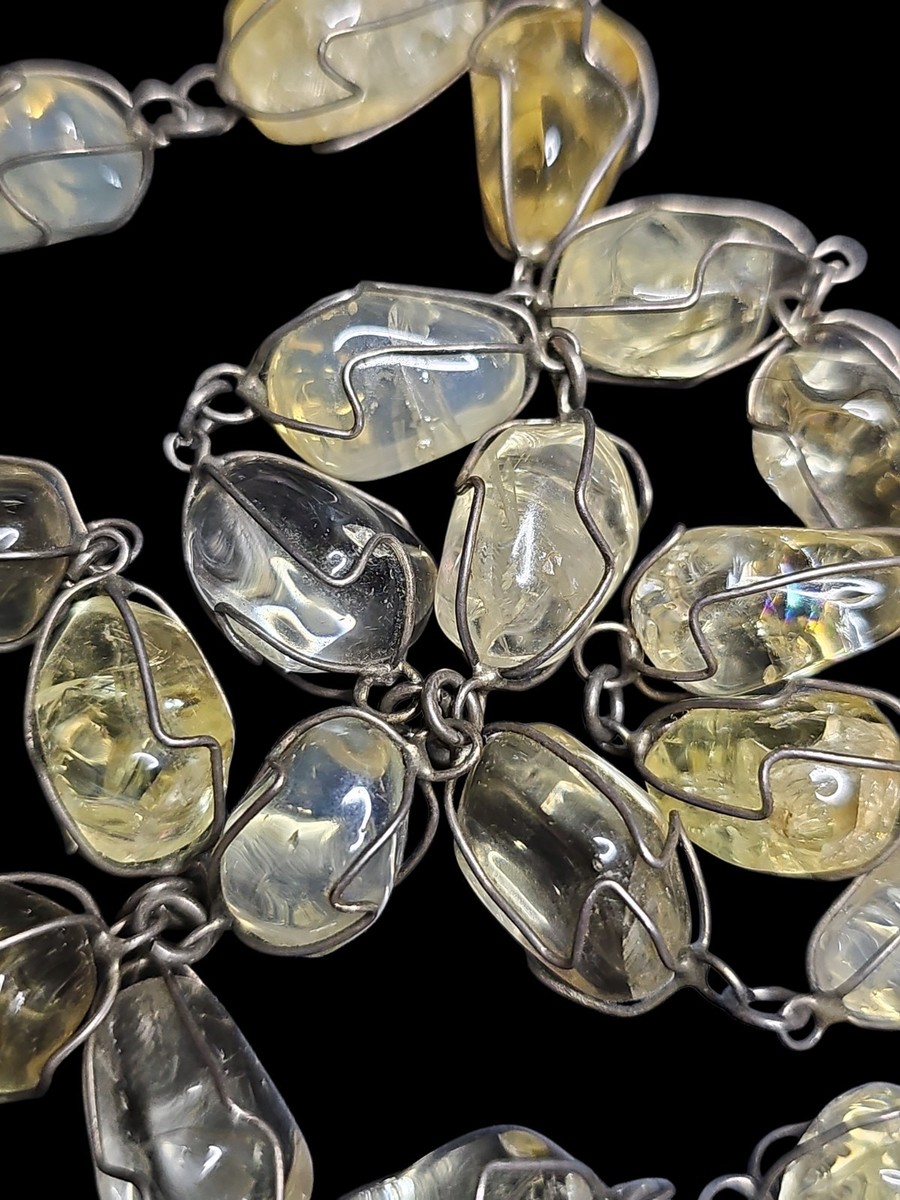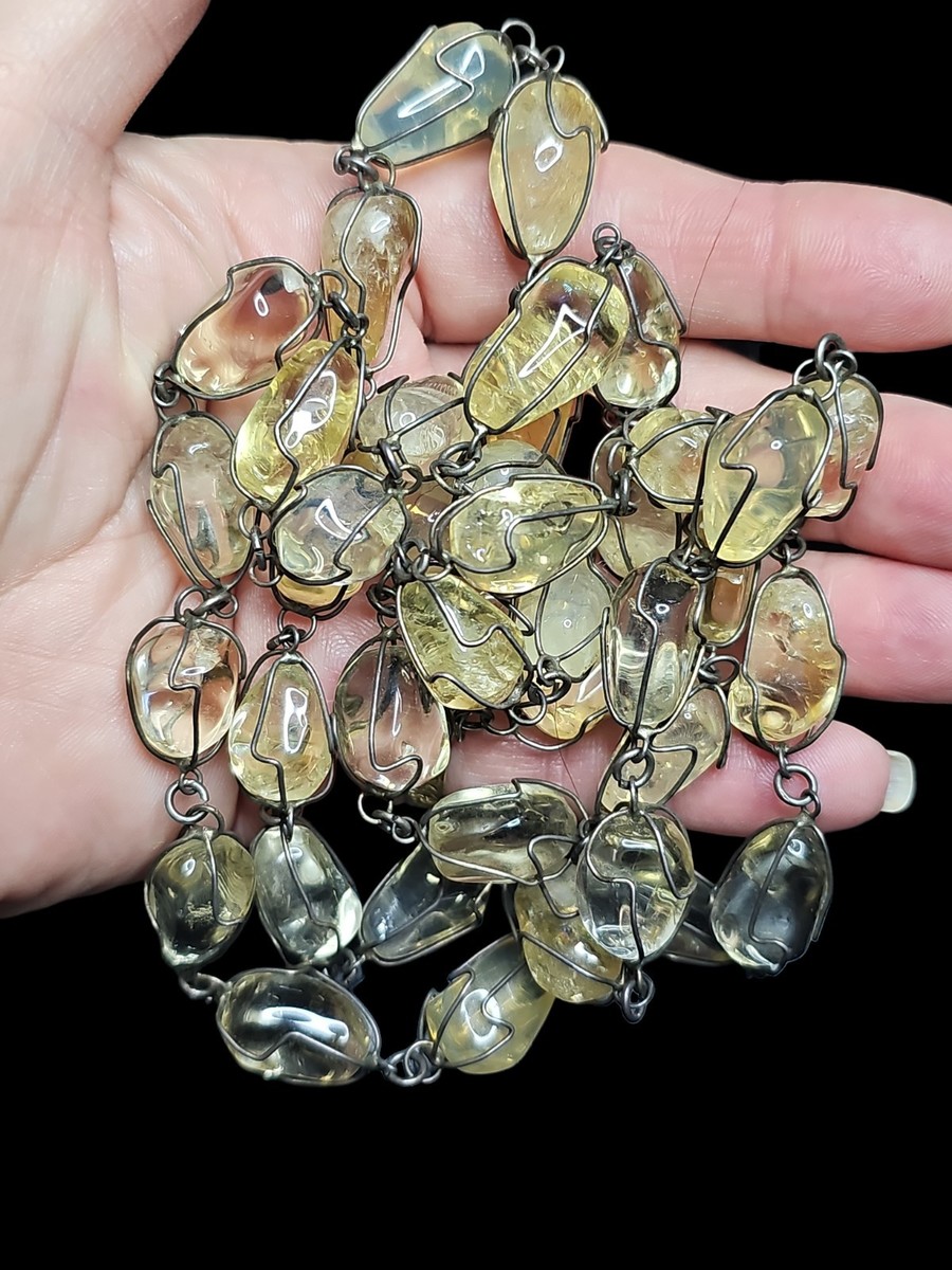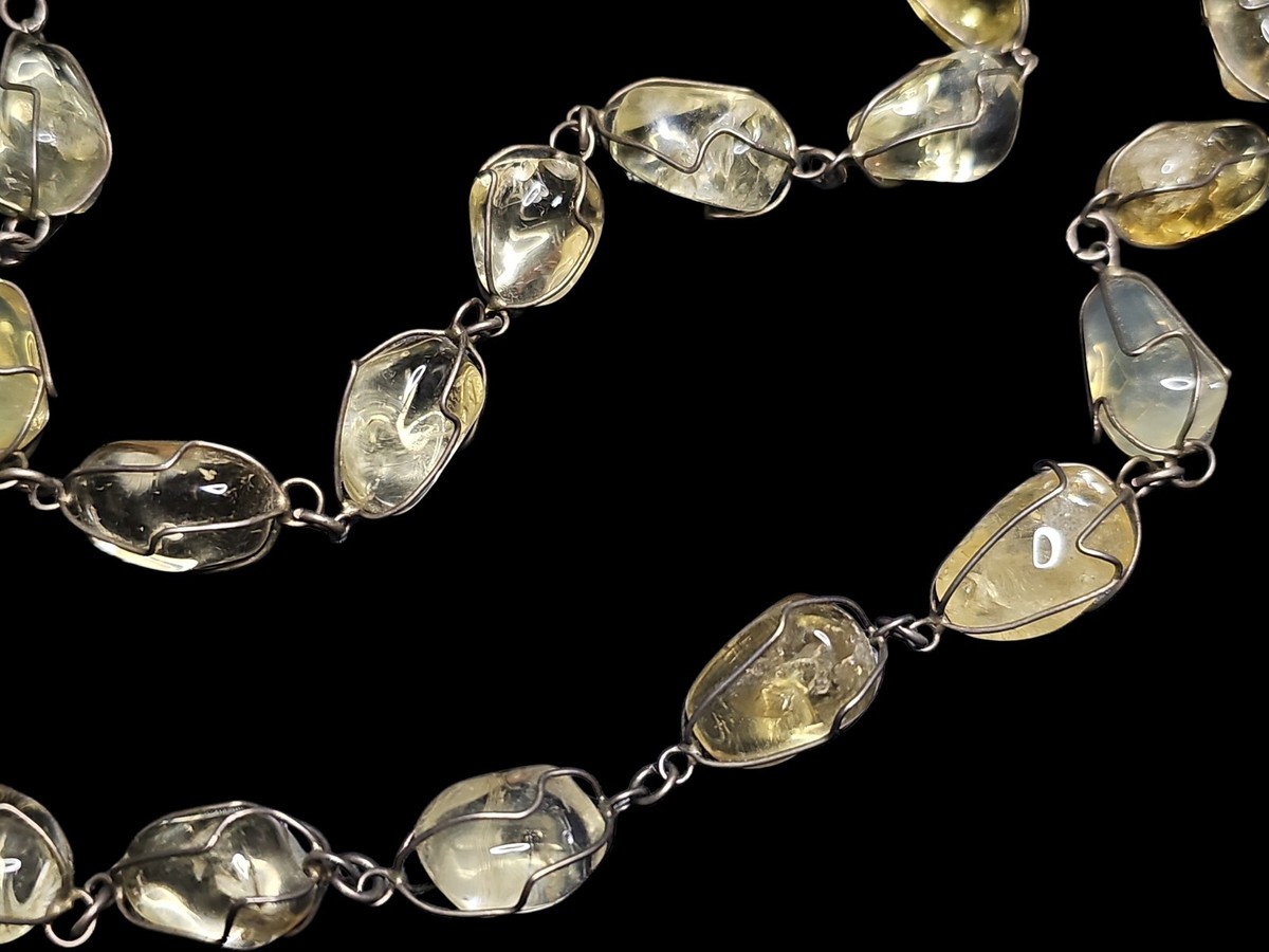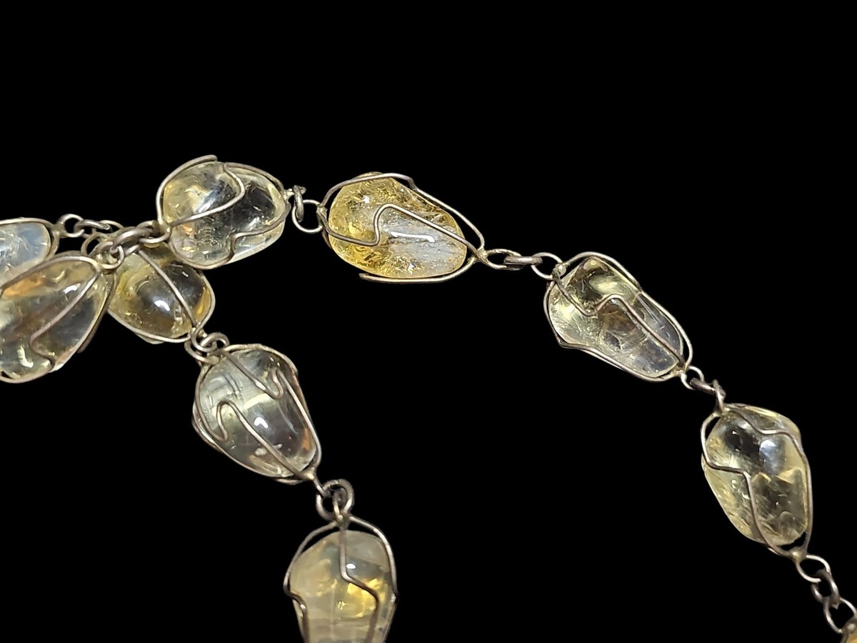 Vintage artisan necklace featuring hand-wrapped translucent yellow nugget stones linked in tested sterling silver. The stones display natural internal character with tones ranging from pale champagne to warm honey yellow, giving the necklace beautiful depth and movement.