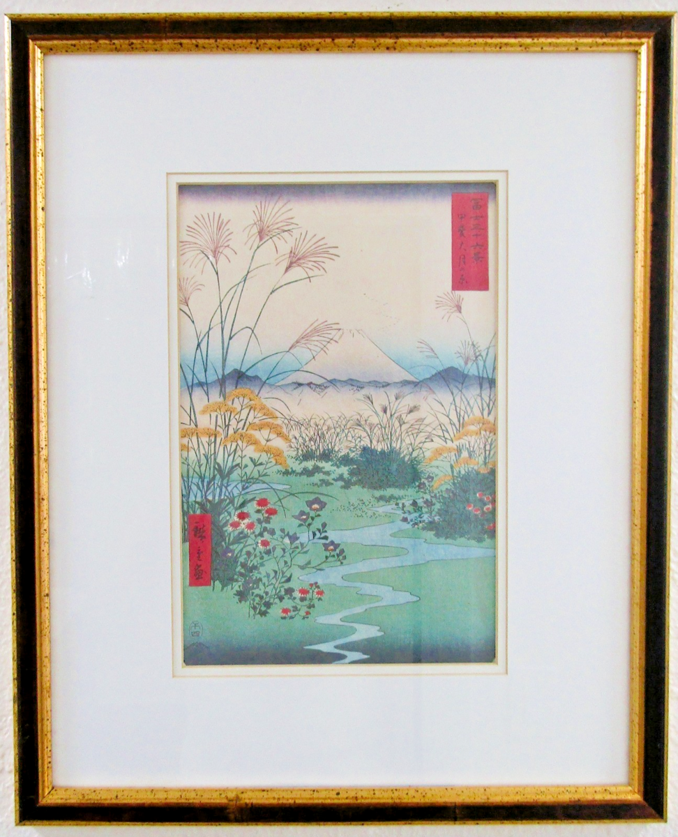 A framed print of the Japanese ukiyo-e woodblock print titled "?tsuki Plain in Kai Province" (Kai ?tsuki no hara), created by the renowned artist Utagawa Hiroshige (And? Hiroshige). The artwork is part of Hiroshige's famous series, Thirty-six Views of Mount Fuji (Fuji Sanj?-Rokkei). It depicts a view of the ?tsuki plain with Mount Fuji visible in the background. The foreground features various autumn wildflowers, including pampas grass, yellow patrinia, and bellflowers, which are traditionally known as the Seven Herbs of autumn (nanakusa). The original print was created in April 1858.