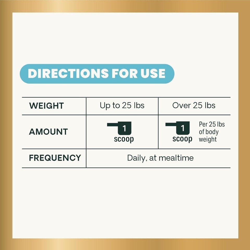 Give 1 scoop per 25lbs of body weight daily at mealtime. |