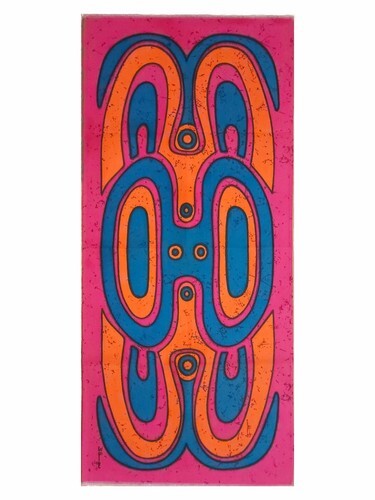 appears to be oil on canvas as it is shiny somewhat but the yellow background is matte in most places and measures about 13"x17". Might be acrylic.