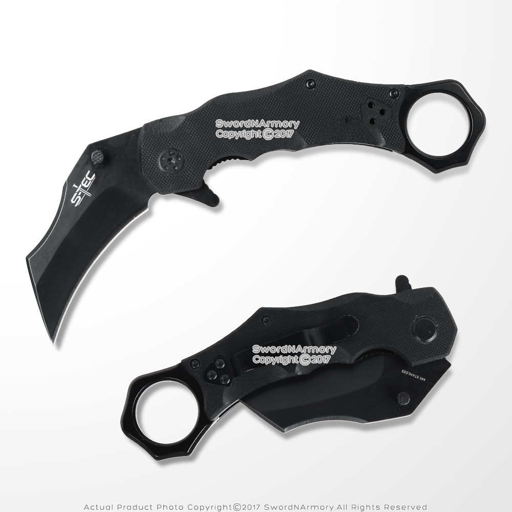 -The blade is 440 Stainless Steel with a thumb stud and curved Karambit style blade.