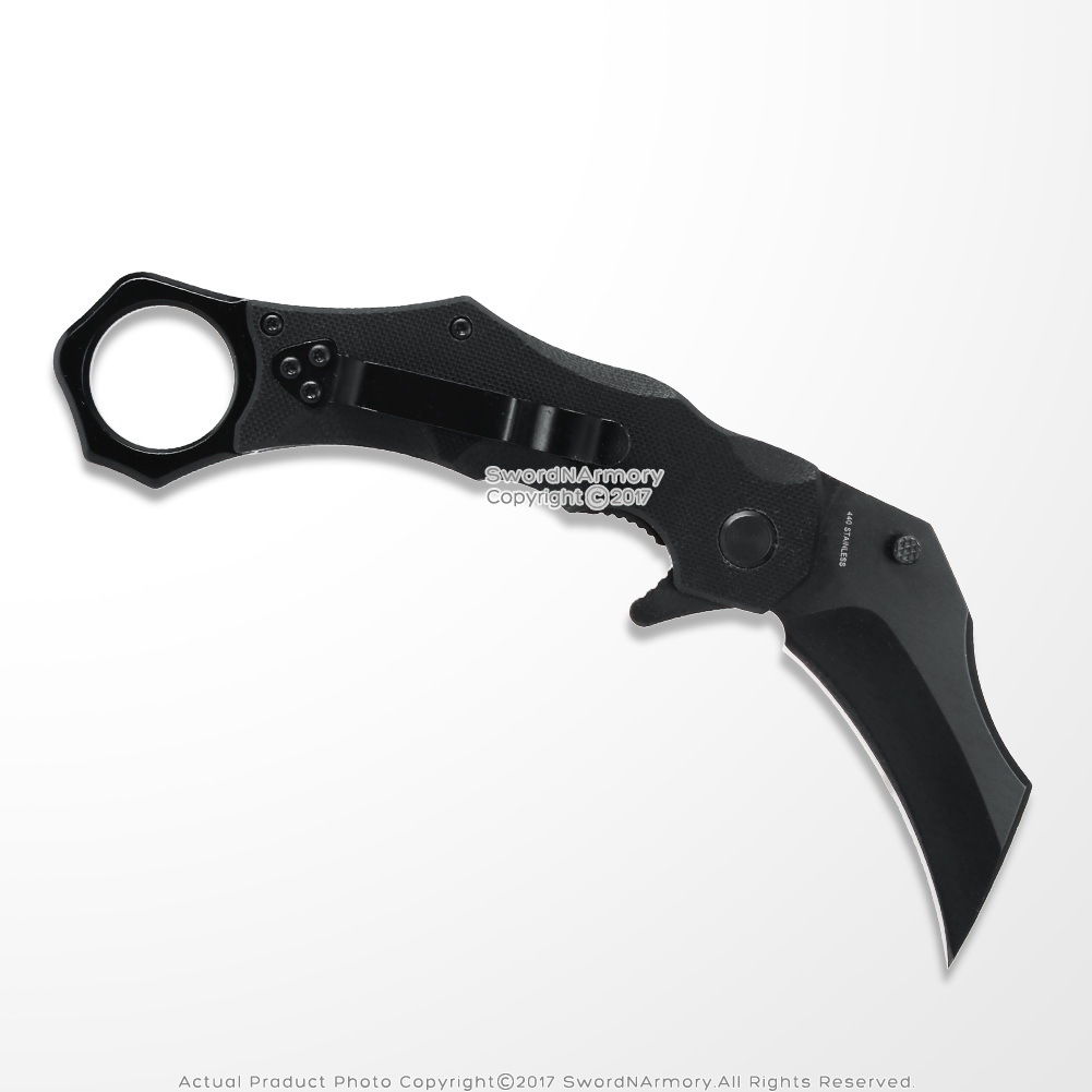 This striking black Karambit style knife has a ring pommel for one finger release and tactical control. This is Not a Spring Assisted Knife.