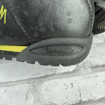 Boots show scuffs from normal use. There is a missing plastic name insert on the left boot.