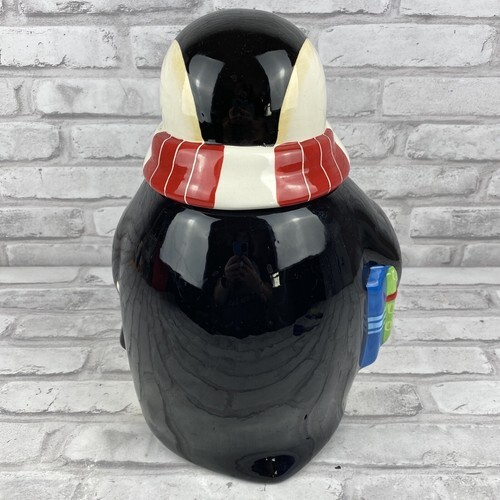 Nonnis Penguin Christmas Holiday Hand Painted Ceramic Cookie Jar Canister