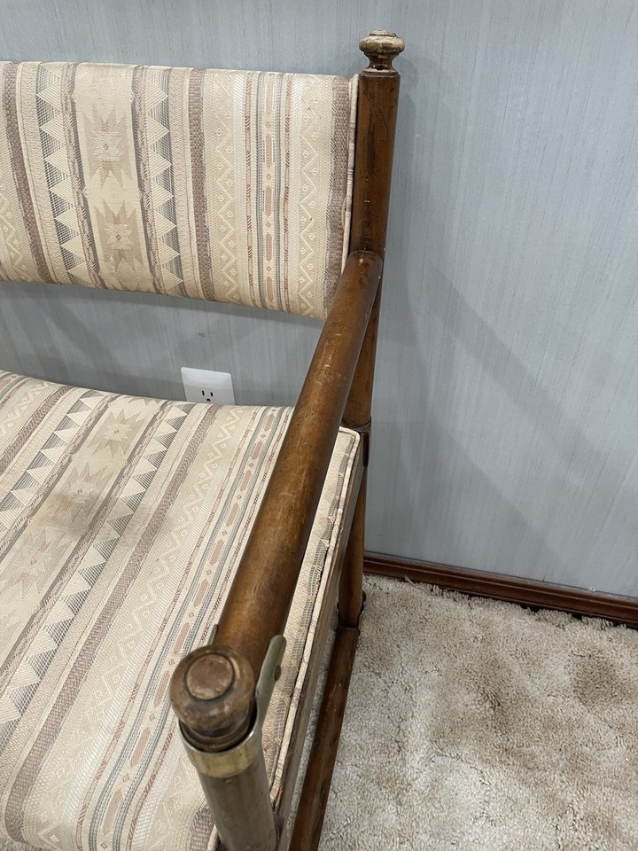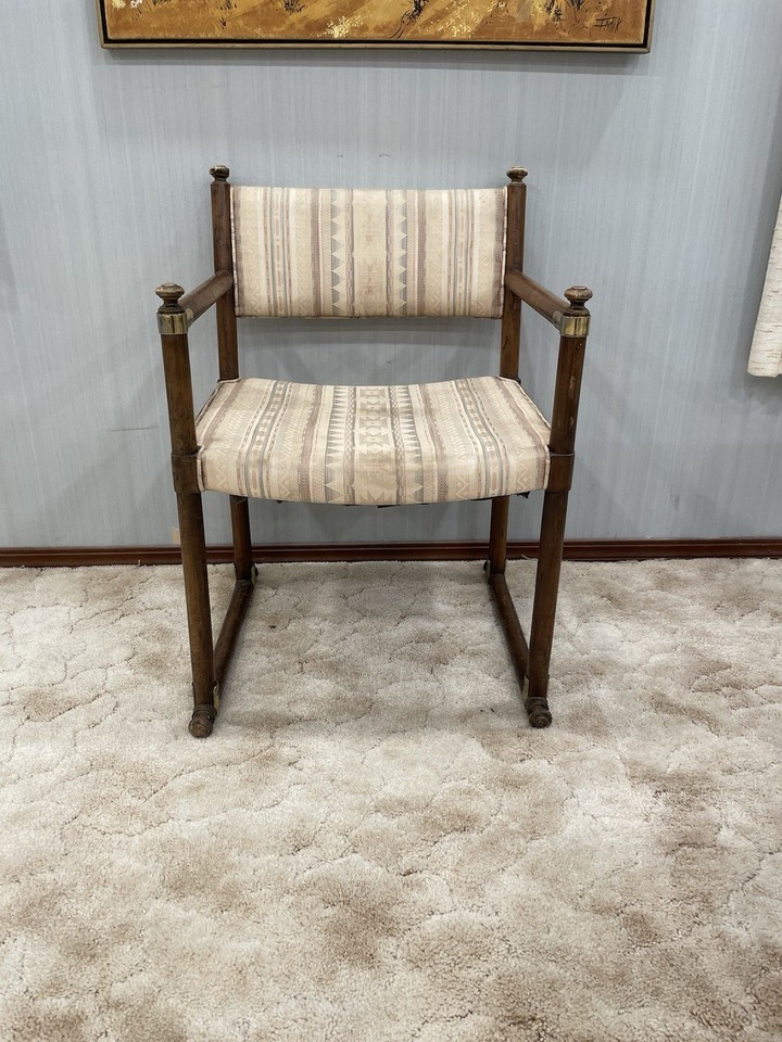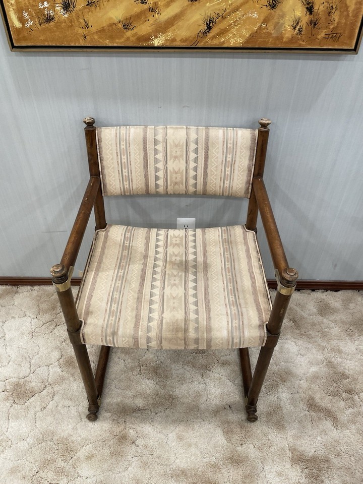 For sale is a vintage wood and fabric armchair made by Drexel Furniture. Some areas of light stains to the fabric. Needs a good polishing.