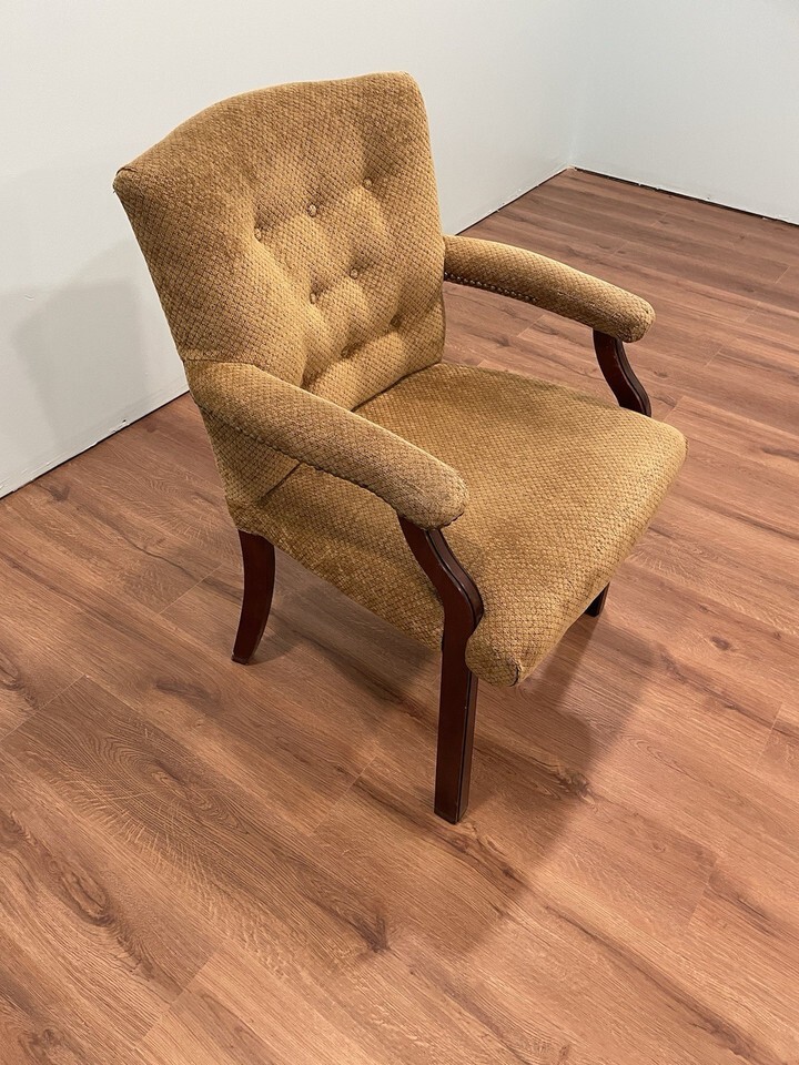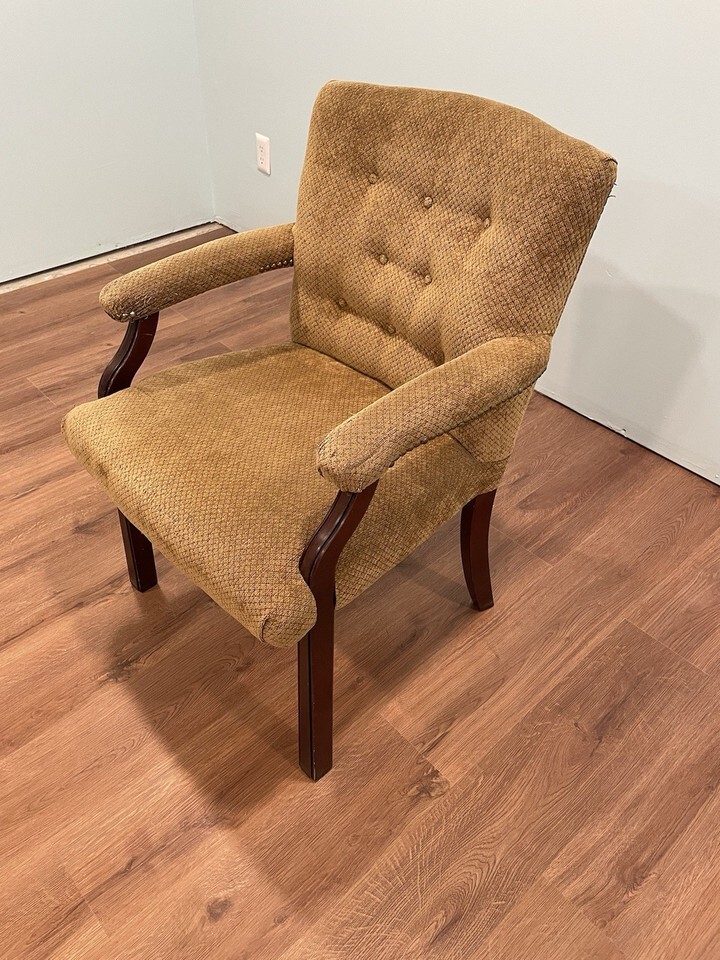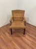 For sale is a nice wood and tan fabric chair. The chair has some very minor edge wear to a couple of arms as shown. Very solid construction.