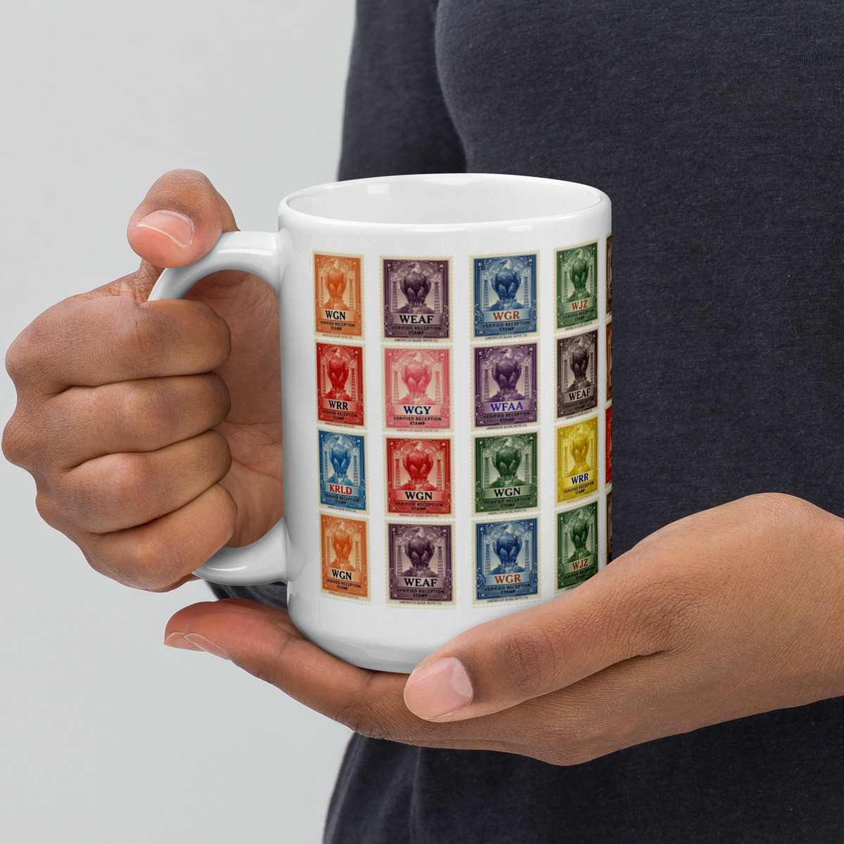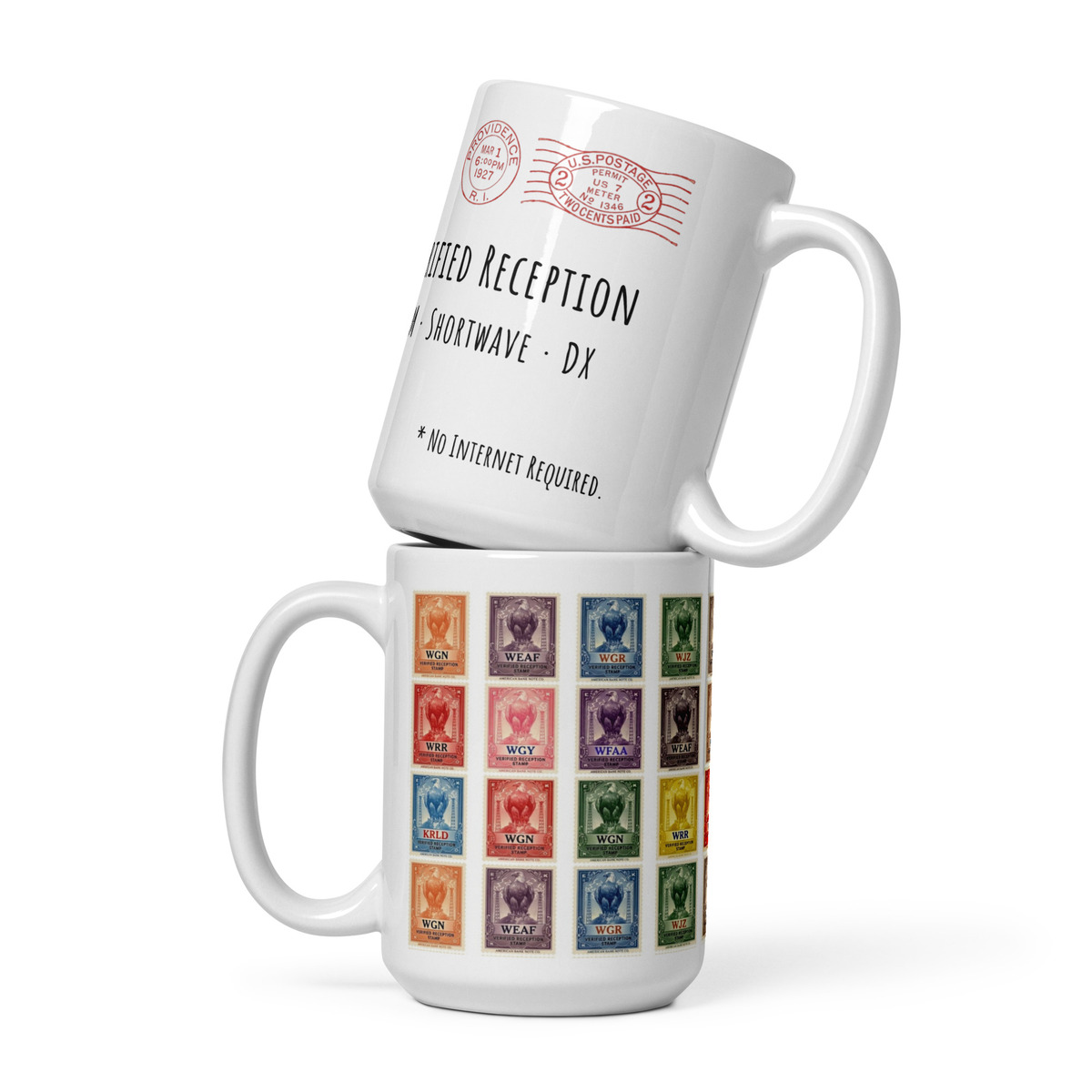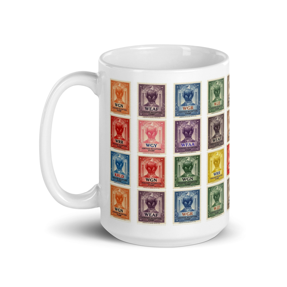 This 15oz ceramic mug features a vibrant collage of early 1920s “Verified Reception” radio stamps, inspired by the golden age of radio listening — when pulling in a distant station meant skill, patience, and a bit of luck with the ether.