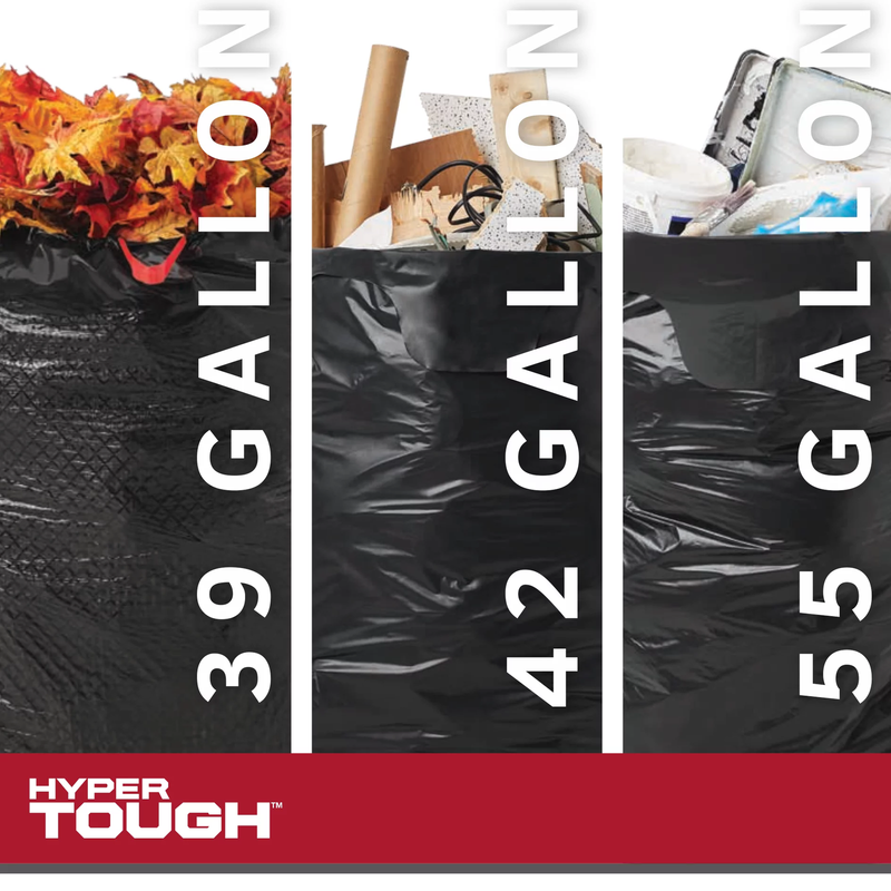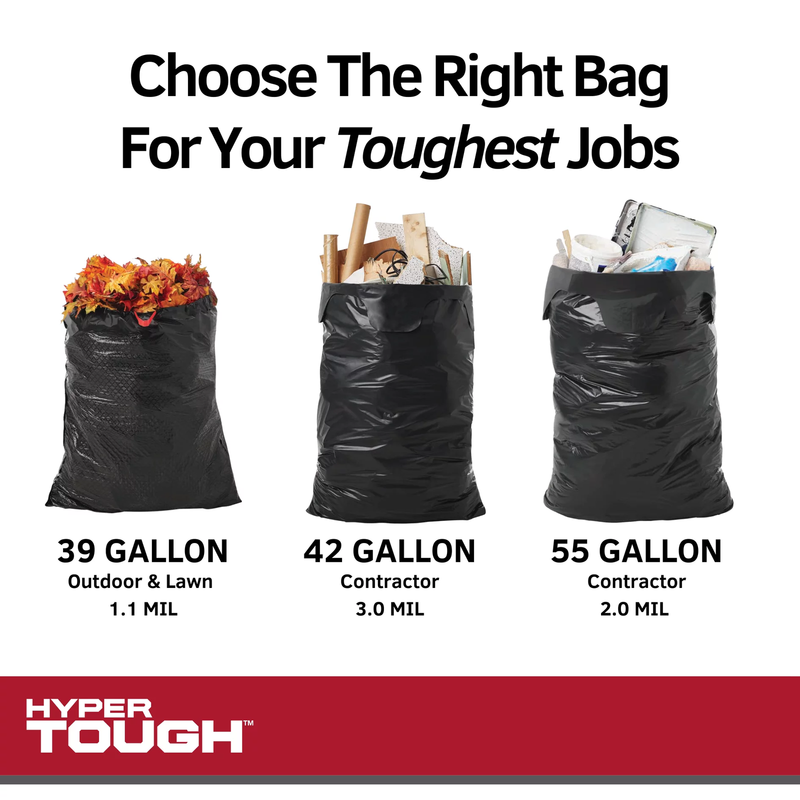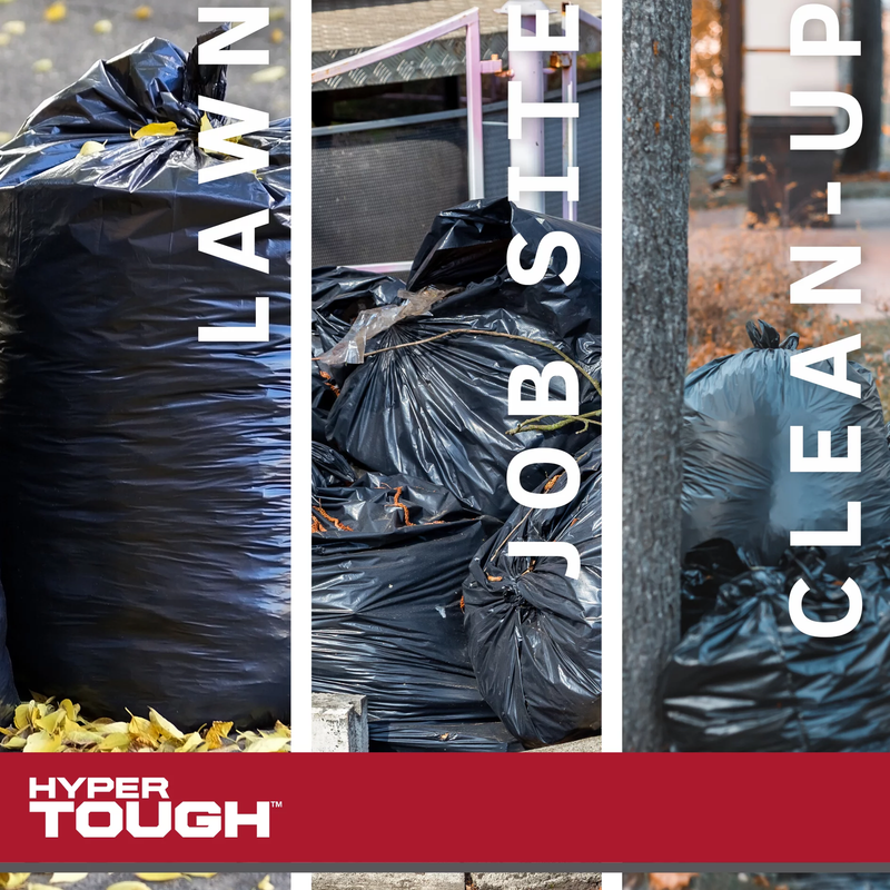 Hyper Tough features a full line of durable lawn and contractor clean-up bags that are perfectly sized for your toughest jobs such as construction site clean-up, DIY home projects, handling of commercial waste and much more. These 39-gallon 30 count extra-large lawn clean-up bags are perfect for containing grass clippings, sticks and leaves, while offering reliable strength, puncture and tear resistance. The drawstring closure makes it easy to contain and dispose of waste, while the convenient one bag-at-a-time dispense saves time while you work. Hyper Tough. Tough Job. Tougher Bag.