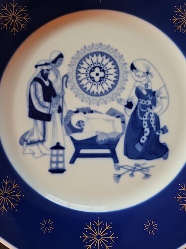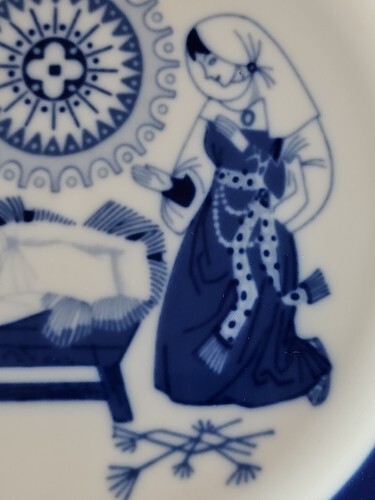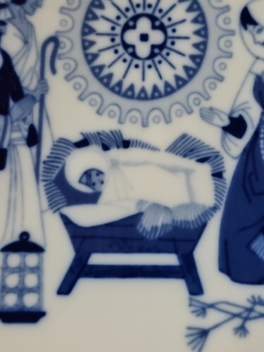 Exclusive Design. A Child Is Born. In Blue and White Colours. Gold Snowflakes around the Edge. Excellent Condition. Beautiful Home Decor. Collectable. Great Gift. Rare Find.