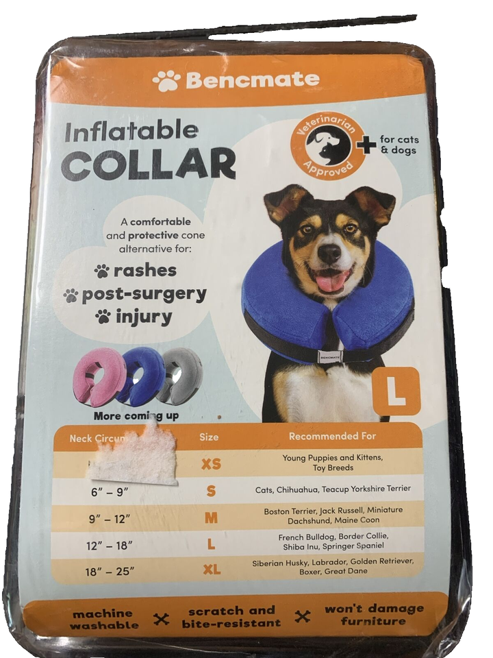 Crafted by one of the leading brands in the pet supplies industry, Bencmate, this inflatable dog collar is new and comes in its original box. It is the ideal accessory for pet owners looking for a reliable and safe alternative to traditional dog cones. With its adjustable strap, it fits most dogs of different sizes comfortably. Say goodbye to the discomfort associated with traditional collars and cones and give your furry friend the ultimate post-surgery or rash care they deserve with the Bencmate Inflatable Dog Collar!
