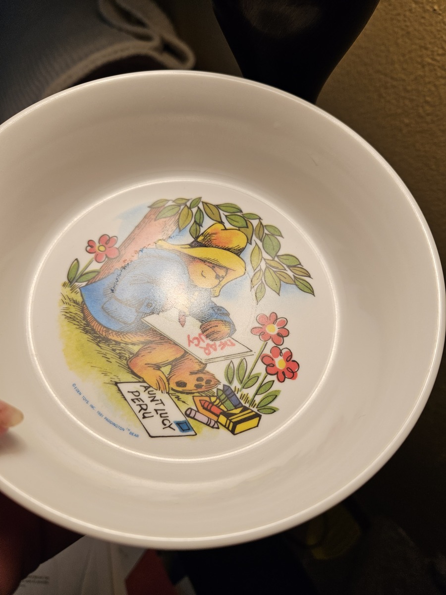 This bowl is white with an image of Paddington Bear sitting under a tree, writing a letter to Aunt Lucy.