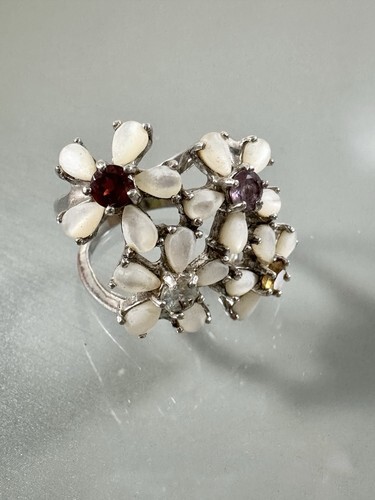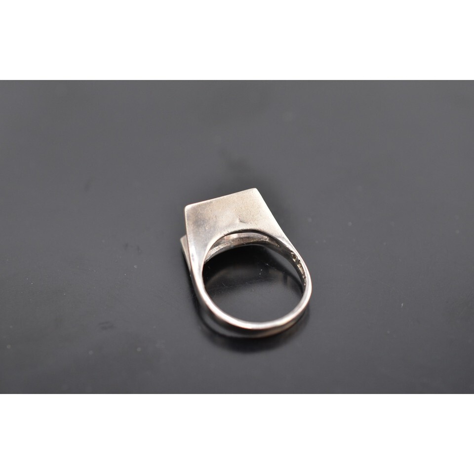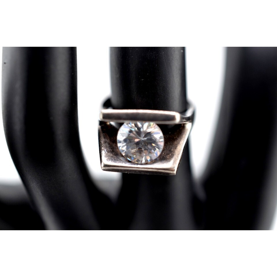 Beautiful ring with clear quartz faceted gem. Ring is size 6.25. Quartz measures approx. 0.4 inches. Weighs 29.2g. Signed but unreadable. Light tarnish and wear due to age.