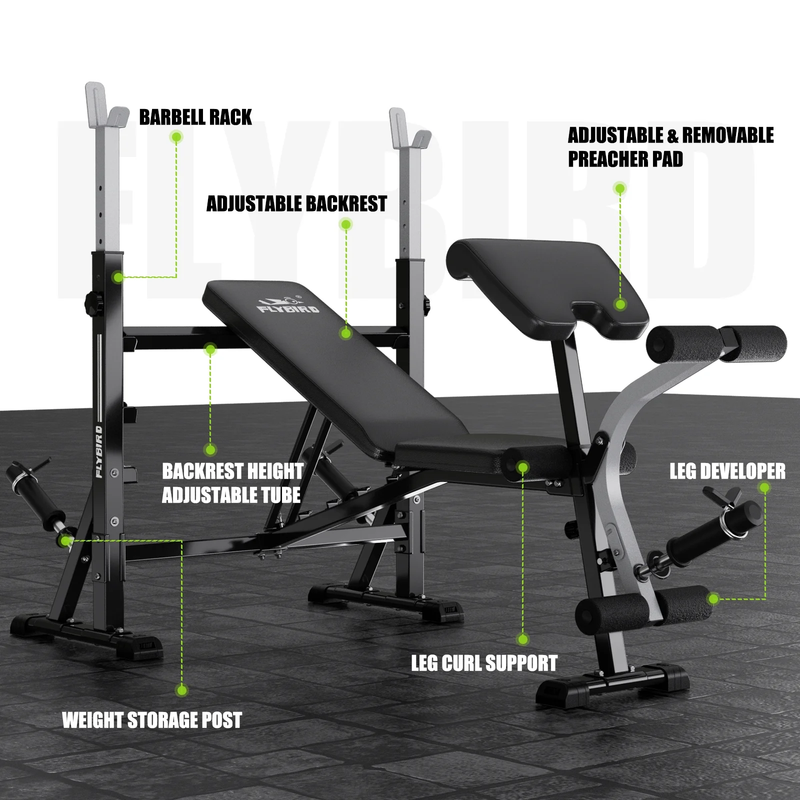 The Flybird Standard Weight Bench is a versatile piece of equipment for your home gym. This bench press set comes with a preacher curl pad and leg developer, making it ideal for a full-body workout. Constructed with premium tubular steel, it's solid and stable, capable of supporting up to 900lbs. The bench offers excellent adjustability with an 8-position backrest and 5 height settings for the barbell rack and preacher curl pad. The dual-function leg developer allows for a full range of motion to effectively exercise your hamstrings, quadriceps, and calf muscles. The preacher curl pad promotes proper posture during arm workouts. The Flybird weight bench is designed for comfort with firm, soft padding and foam. It's easy to assemble and suitable for all body types.