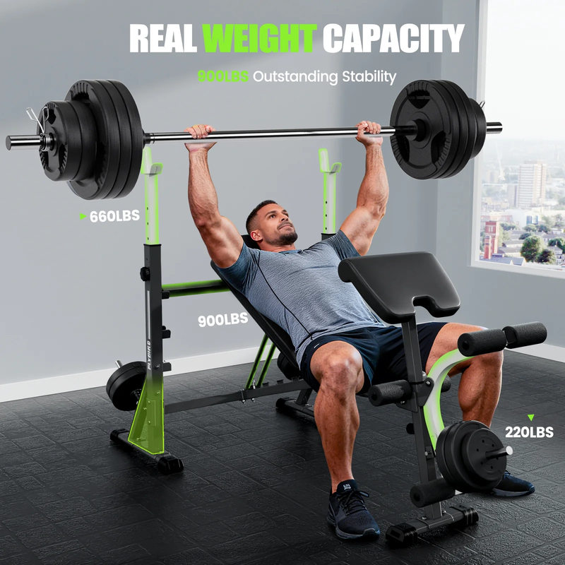 This FLYBIRD all-in-one solution combines a weight bench, barbell rack, preacher curl bench, and leg developer machine for a versatile home gym setup. Features an 8-position adjustable backrest for varied exercise angles. Offers 5 distinct height settings for both the barbell rack and the preacher curl pad. Constructed with premium tubular steel for enhanced durability and stability. Designed to support a maximum weight capacity of up to 900 lbs. The dual-function leg developer provides a full range of motion for targeting hamstrings, quadriceps, and calf muscles. The leg developer has a weight capacity of 220 lbs. The leg developer can be locked to facilitate effective abdominal exercises for core strength development. The integrated preacher curl pad helps promote proper posture during arm workouts. Equipped with firm, soft padding and foam for a comfortable workout experience. Engineered for straightforward and easy assembly. Suitable for users of all body types, including beginners and intermediate lifters. Allows for a wide variety of exercises targeting legs, back, chest, abs, shoulders, and arms. Provides a comprehensive setup for building strength and improving fitness in a home environment. Weights are not included.