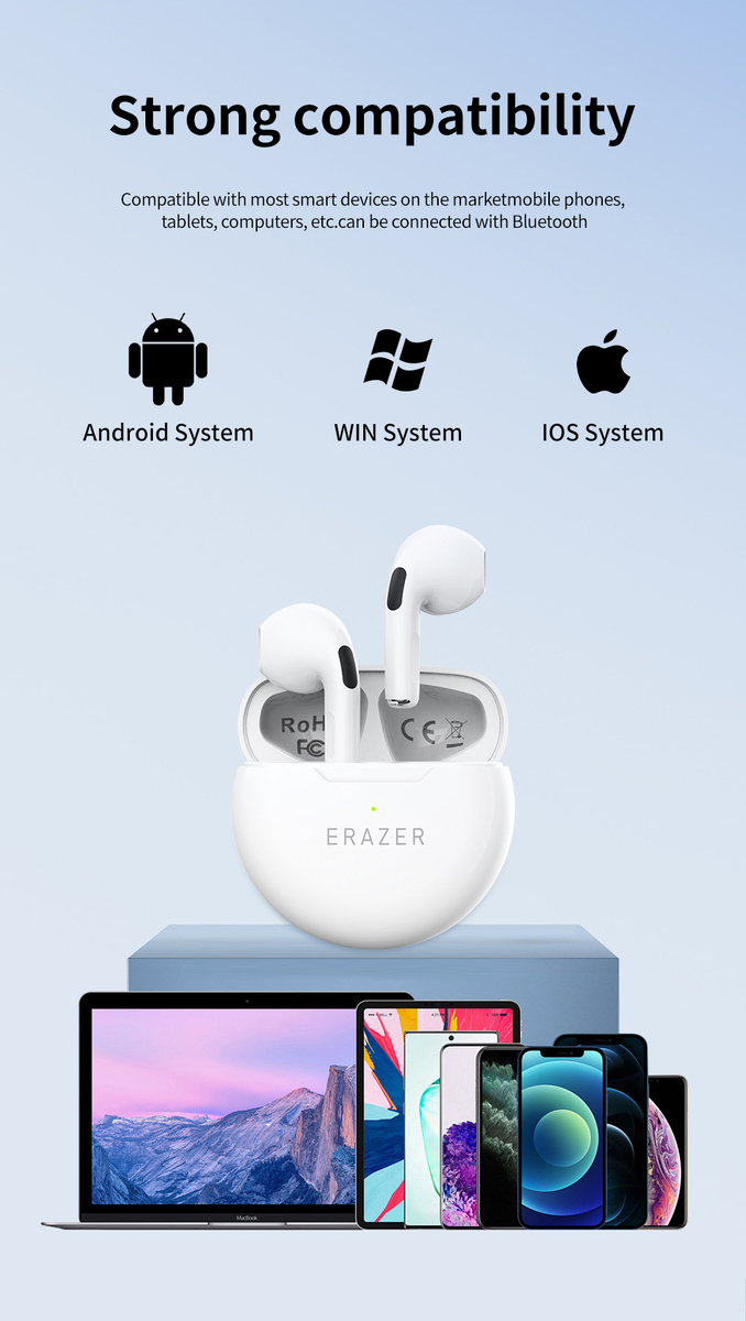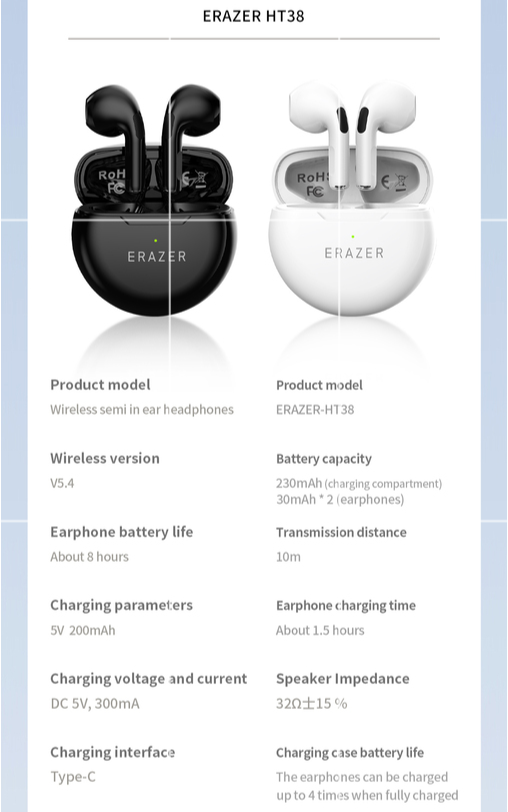 The compact charging case provides convenient power anytime, while the sleek design makes these earphones ideal for travel, workouts, or daily use. Fully compatible with iPhone, Android, and other Bluetooth-enabled devices, the ERAZER HT38 is a reliable choice for premium wireless audio at an excellent value.